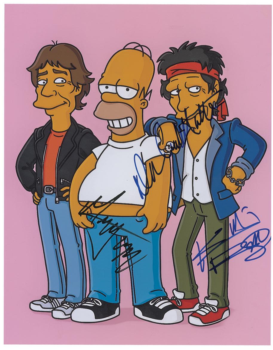 Color satin-finish 11 x 14 photo of an animated Mick Jagger and Keith Richards posing with Homer Simpson, signed in black felt tip by Mick Jagger and in blue felt tip by Keith Richards and the voice of Homer Simpson, Dan Castellaneta. In fine condition, with a couple trivial corner tip dings. While readily available in signed photos, this is only the second photo we have offered of the Stones in cartoon form.