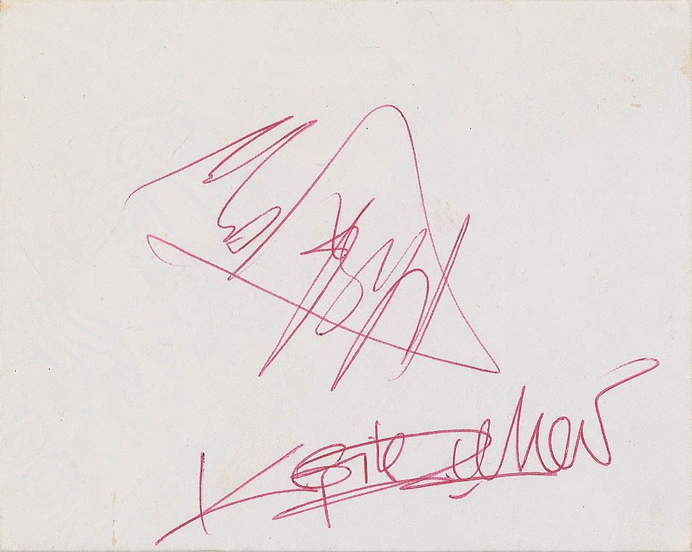 An off-white 4.5 x 3.75 envelope, signed on the front in red ballpoint by Mick Jagger and Keith Richards. Signatures date to 1965. In fine condition.