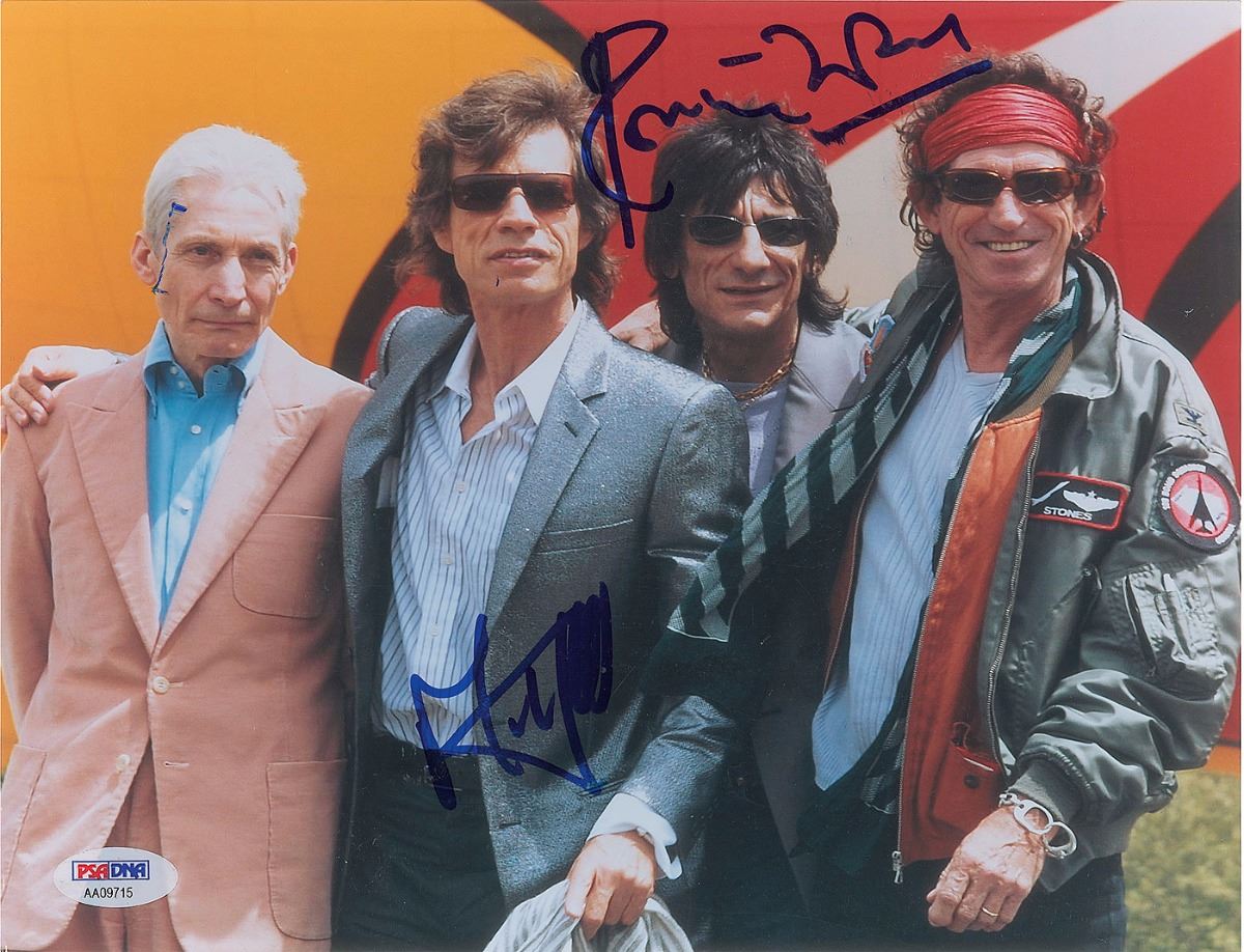 Color glossy 10 x 8 photo of the Rolling Stones, signed in blue felt tip by Ronnie Wood and Mick Jagger. In fine condition, with a stray ink mark on the side of Watts’ face. Accompanied by a full letter of authenticity from PSA/DNA.