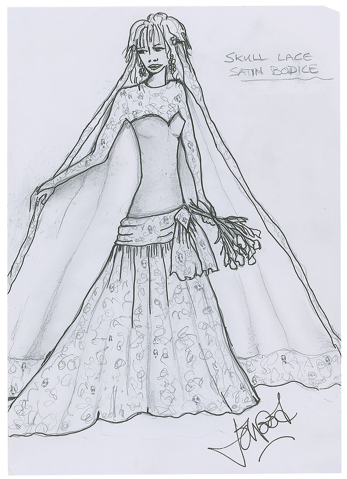 Wonderful original sketch by Jo Wood of a bride in her wedding dress and holding a bouquet of flowers, accomplished in graphite and black felt tip on a white 8.25 x 11.75 sheet, with Wood signing below and adding above, "Skull Lace, Satin Bodice." In fine condition. Wood drew this attractive bridal sketch as part of the Brides magazine 'Art with a Heart' project in 2014, which featured high profile names from fashion, art, music, media, and television sketching their ultimate wedding dress.