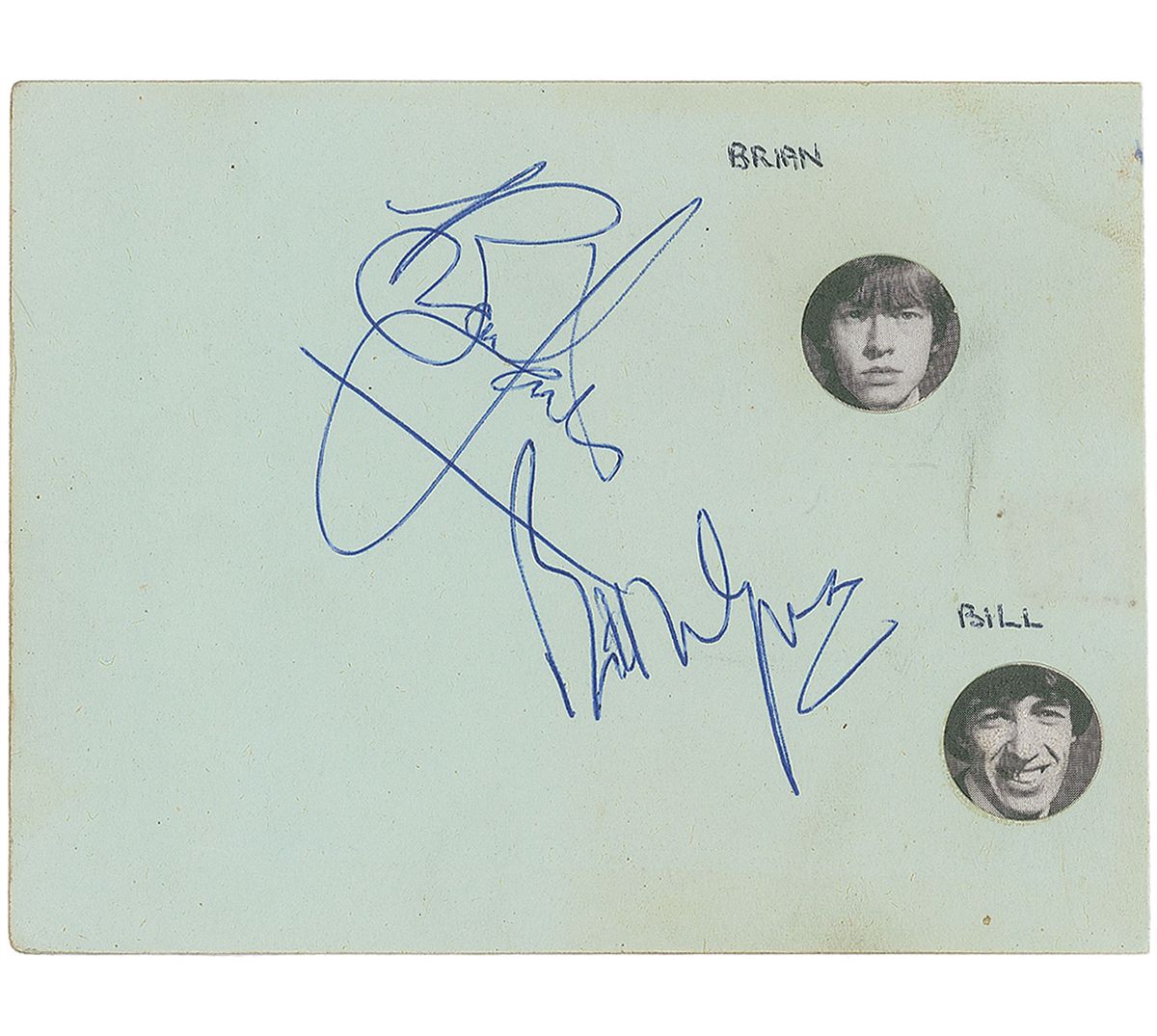 Vintage ballpoint signatures, “Brian Jones,” and “Bill Wyman,” on a 5.25 x 4 light green album page, with small clipped photos of both band members affixed to the right side of the page. In fine condition.
