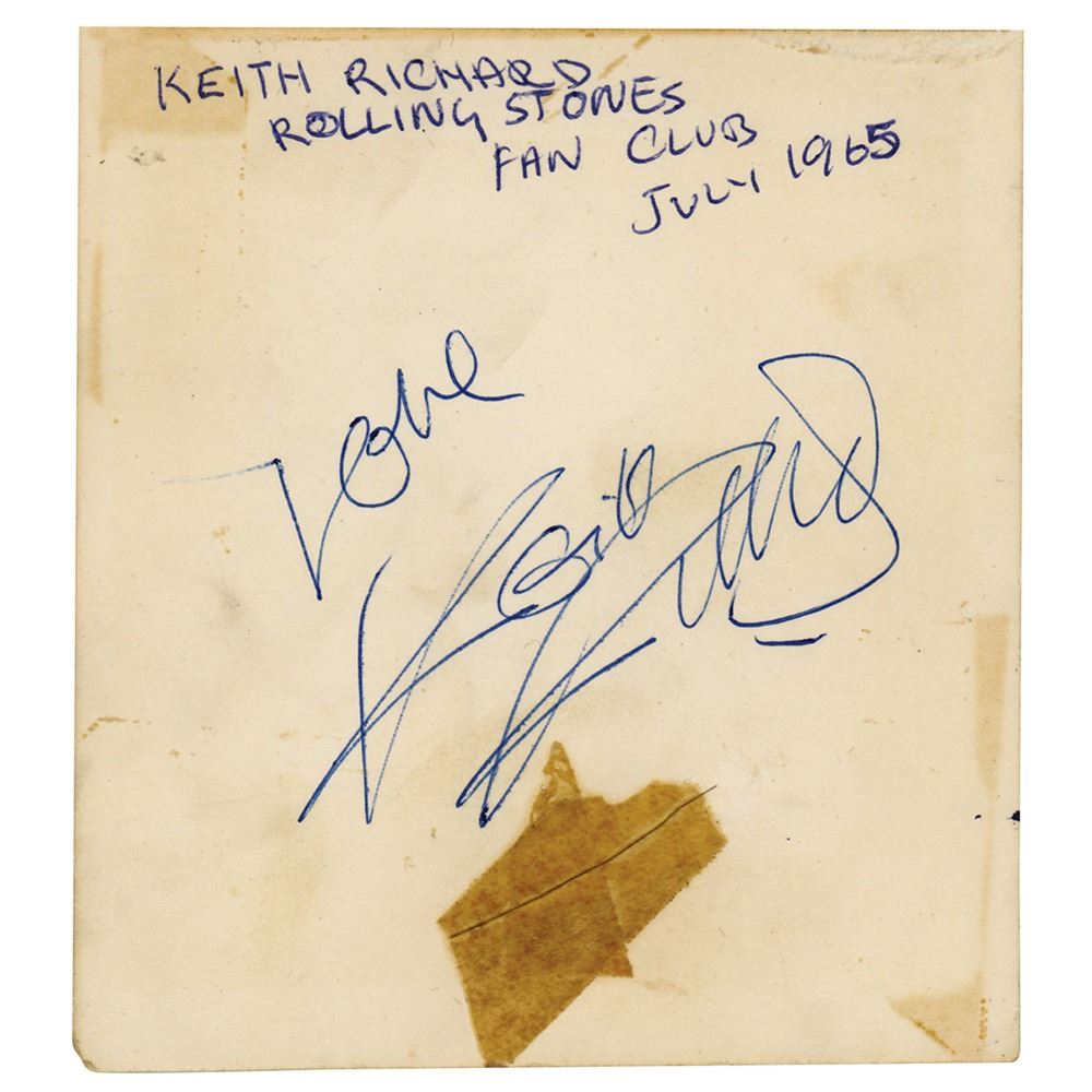 Vintage ballpoint signature, “Love, Keith Richard,†on an off-white 4 x 4.25 album page with a taped-down strand of Richards’s hair. Collector's notation dates the autograph and the hair strand to outside the Rolling Stones fan club offices in July 1965. In very good to fine condition, with light soiling and toning, and old tape holding the single hair in place. Accompanied by a certificate of authenticity from Tracks.