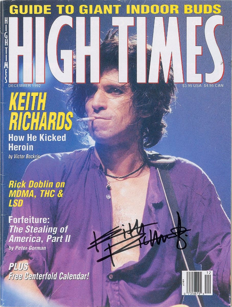 High Times magazine from December 1992, 8.25 x 10.75, 80 pages, boldly signed on the front cover in black felt tip by Richards. In fine condition.