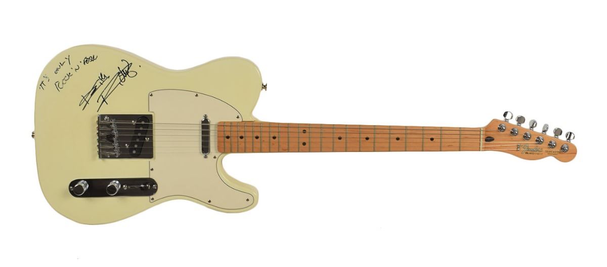 Cream-colored Fender telecaster right-handed electric guitar, serial number MN2119417, signed on the body in black felt tip by Richards, who adds "It's only rock 'n' roll." Gig bag is included. In fine condition.