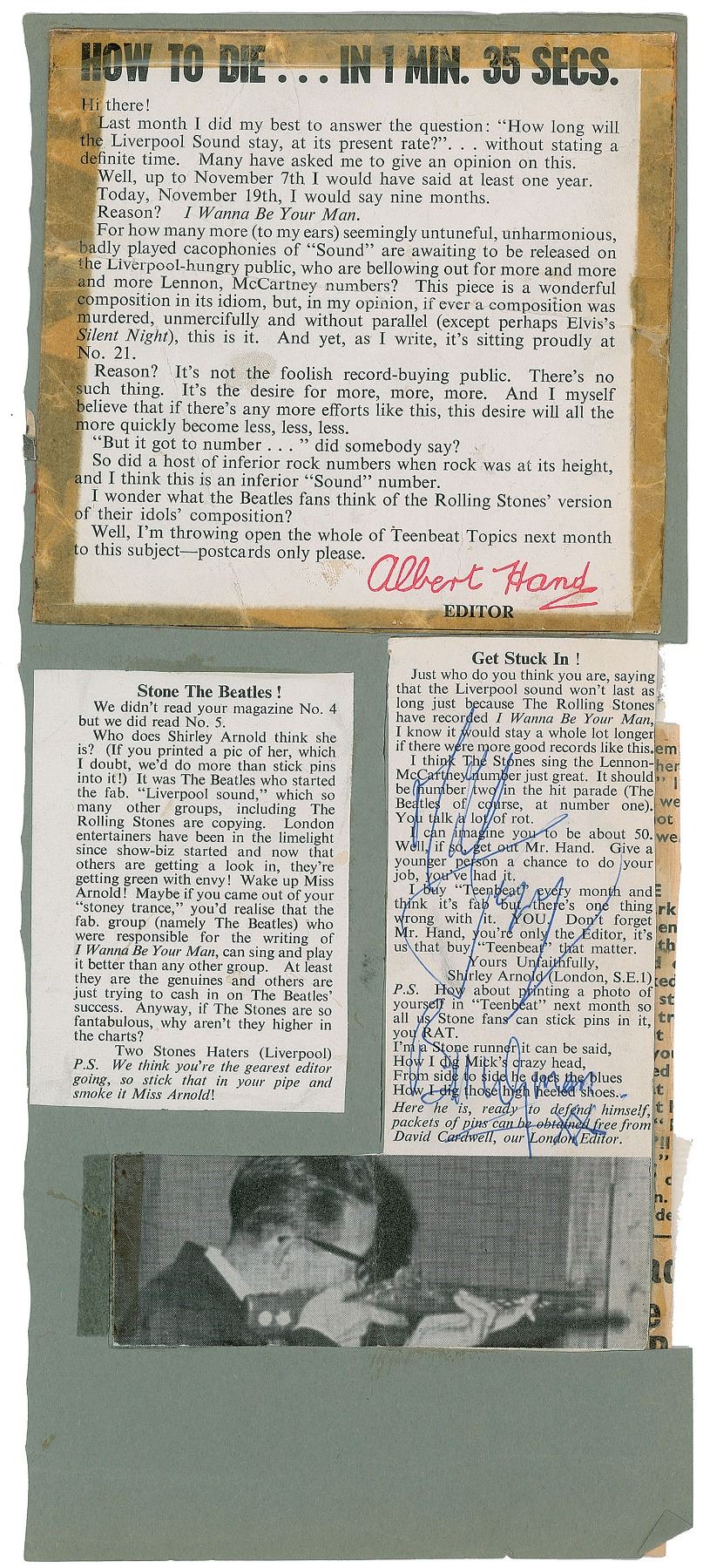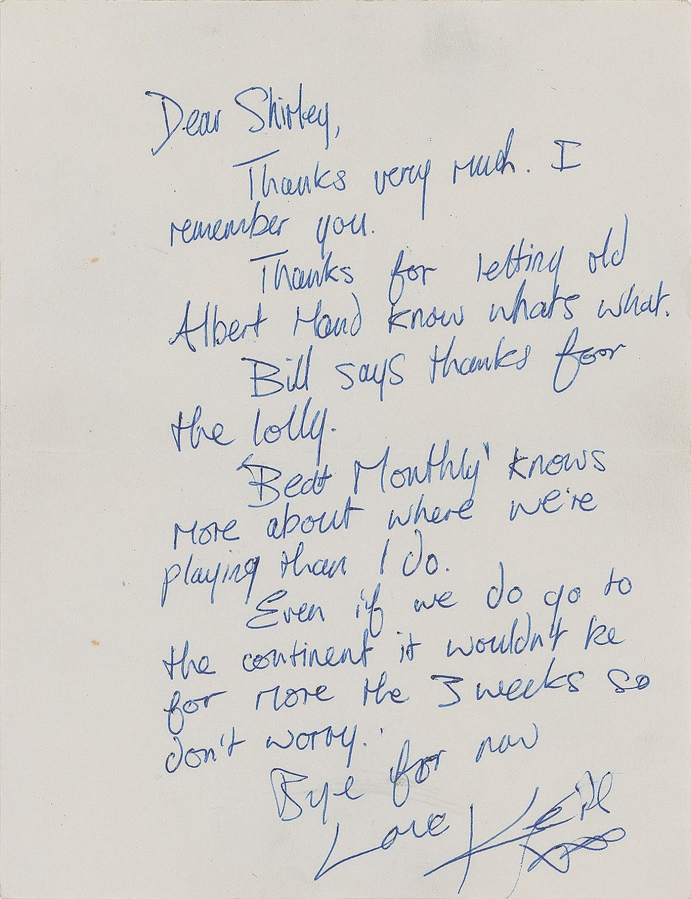 Rare ALS signed “Keith, xxx,” one page, 5.25 x 7, circa December 1963. Letter to Shirley Arnold, the secretary for the Rolling Stones Fan Club, in full: "Thanks very much. I remember you. Thanks for letting old Albert Hand know what's what. Bill says thanks for the lolly. 'Beat Monthly' knows more about where we're playing than I do. Even if we do go to the continent it wouldn't be for more th[an] 3 weeks so don't worry. Bye for now." Also includes two ballpoint signatures, "Mick Jagger" and "Bill Wyman, XX," on a 2 x 4 article clipped from a copy of Beat Monthly, which features Arnold's printed response to Hand's negative review of a Rolling Stones song; the article is affixed to a 5 x 12 mount bearing attached copies of Hand's review, an image of Hand, and a printed response backing Hand's critique. In overall fine condition. Accompanied by a certificate of authenticity from Tracks and a letter of provenance from Arnold, in part: "In November 63, the editor of Beat Monthly Magazine, wrote a scathing review of The Stones second single, 'I Wanna be Your Man,' written by Lennon/McCartney. I wrote to the editor telling him what I thought of him and his review, which was printed the following week…Early 64 I went to work for the band. I stayed working for them until 1972."