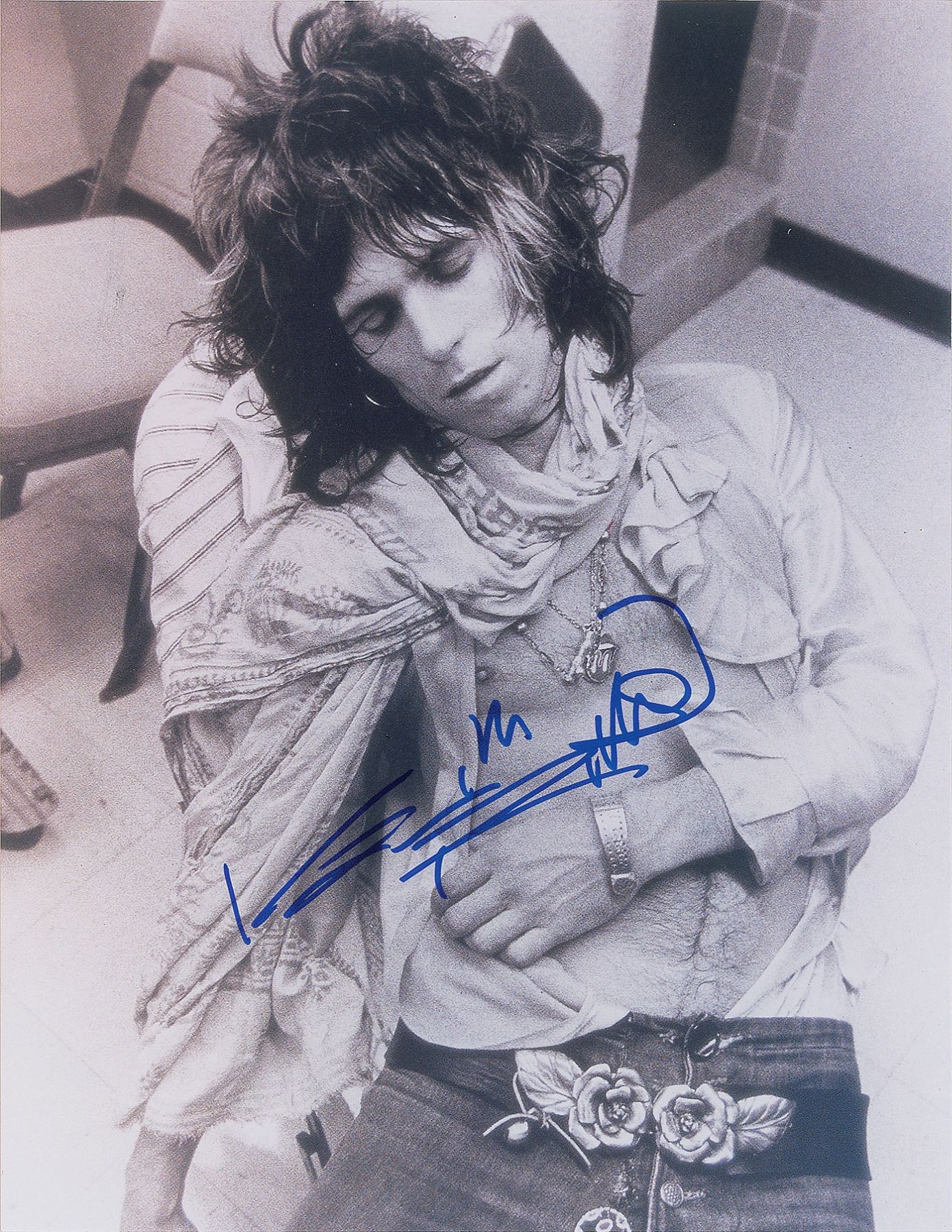 Glossy 8 x 10.25 photo of Richards as taken by photographer Annie Leibovitz in 1972, showing the Stones guitarist passed out in a chair, signed in blue felt tip. In very fine condition.