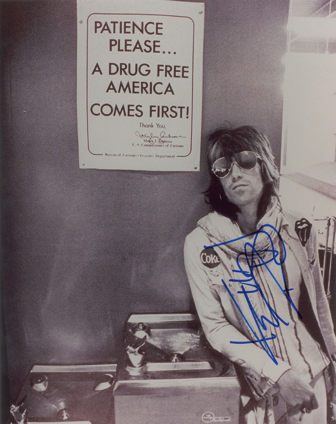 Glossy 11 x 14 half-length photo of Keith Richards leaning on a water fountain under an anti-drug sign, signed in blue felt tip by the Rolling Stones guitarist. In fine condition.