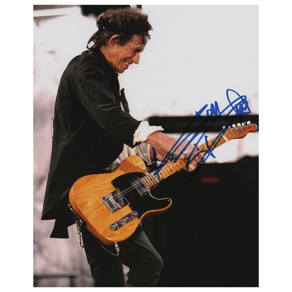 Color satin-finish 8 x 10 photo of the Rolling Stones guitarist during a live performance, signed in blue felt tip by Keith Richards. In fine condition.