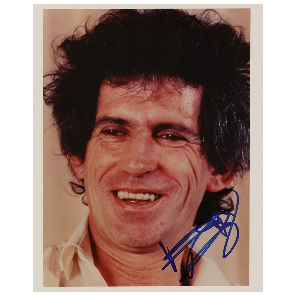 Color glossy 8 x 10 close-up photo of the Rolling Stones guitarist, signed in blue felt tip by Keith Richards. In very fine condition.