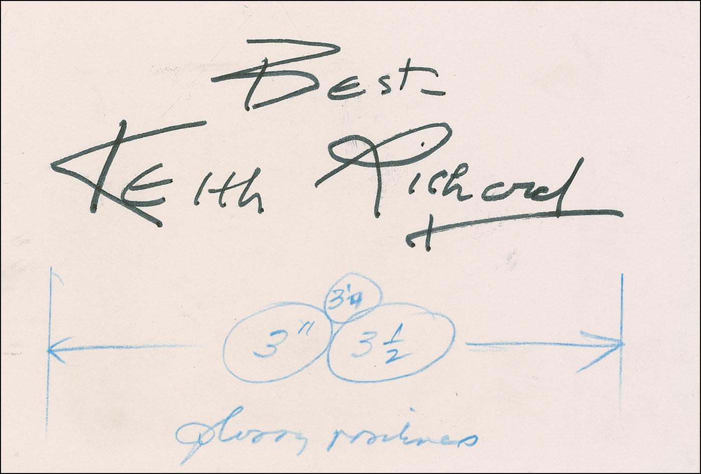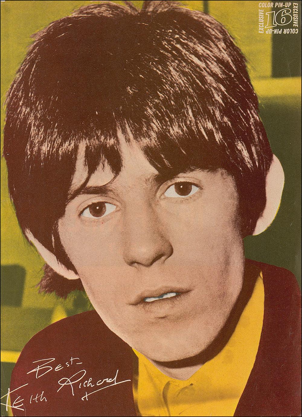 Remarkably bold and clear vintage felt tip signature, “Best—Keith Richard,” on a white 6 x 4 card. In fine condition, with a few production notes beneath the note that can be easily matted out if so desired. Richards dropped the ‘s’ from his name in 1963 and professionally used ‘Keith Richard’ though the late 1970s. According to our consignor, this card was signed circa 1965 for 16 Magazine and then combined with a photo and published. Accompanied by a loose page from the magazine showing the finished product and this exact signature, as well as a full copy of the September 1966 issue with the photo and this signature appearing on page 19.