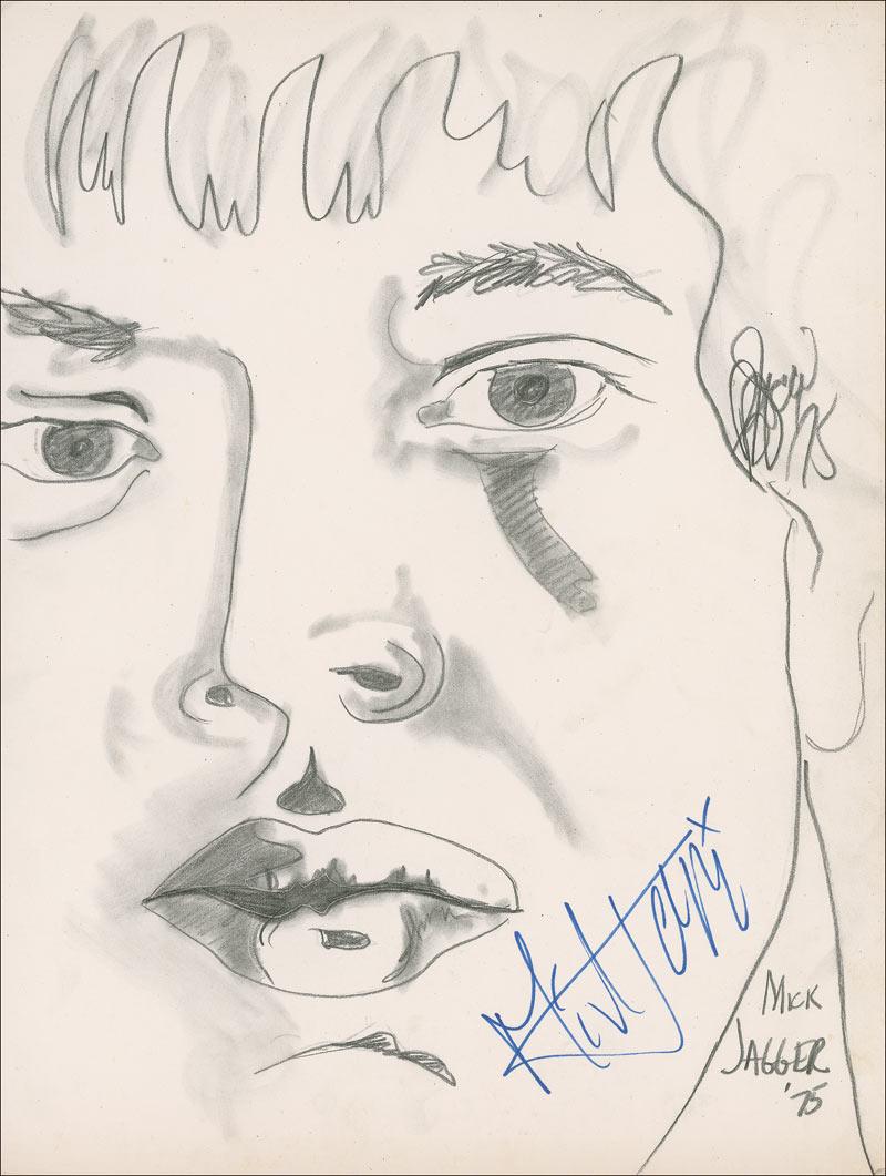 Original pencil sketch of Jagger done by an admirer on an off-white 9 x 12 sheet, signed in blue felt tip, “Mick Jagger X.” In fine condition, with light edge toning.