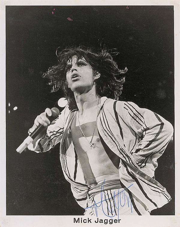 Glossy 8 x 10 photo of Jagger preening on stage, signed in blue ballpoint. In very good condition, with scattered surface loss, filled in with felt tip, scattered creases and surface impressions, and some spotting and wear to finish.