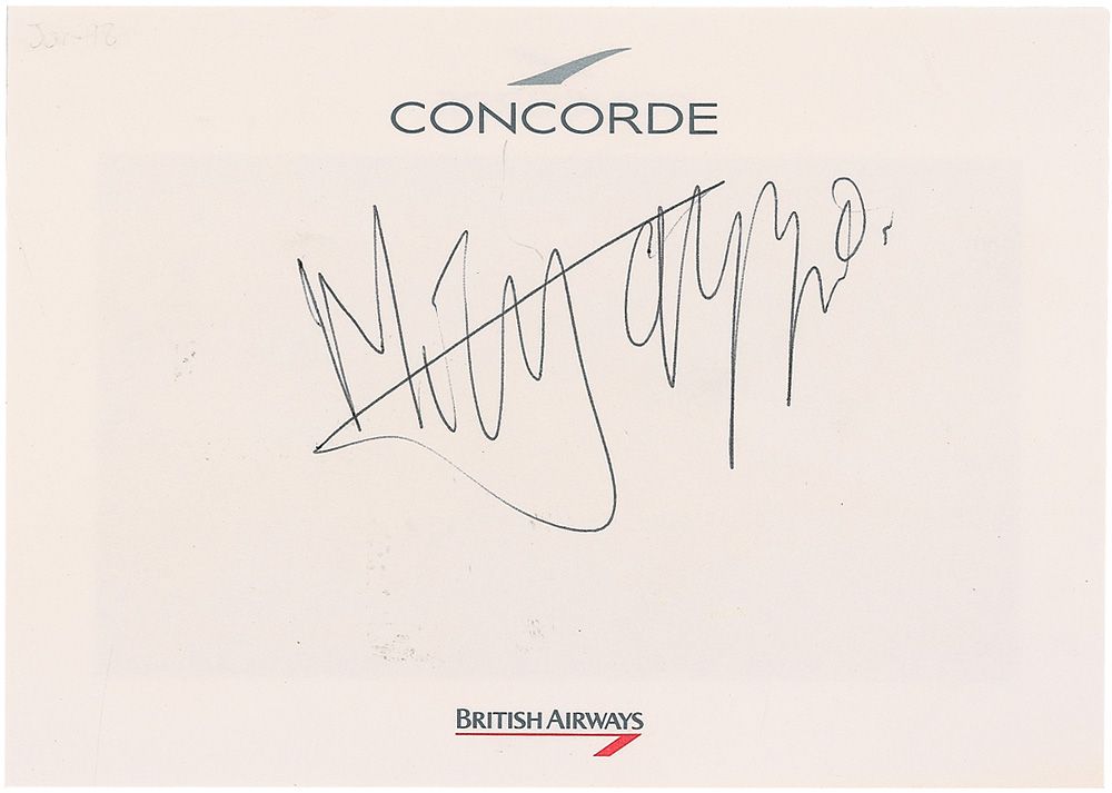 Color 5.75 x 4 postcard of the Concorde, signed on the reverse in black ballpoint by Jagger. In fine condition. Accompanied by a certificate of authenticity from Tracks.