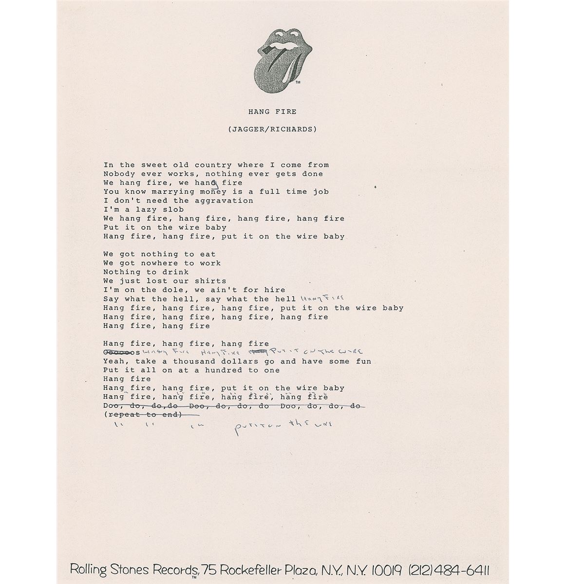 Typed lyrics for ‘Hang Fire,’ one page, 8.5 x 11, copied Rolling Stones letterhead, circa 1981. Jagger corrected the lyrics in his own hand, adding “Hang Fire” three times and “Put it on the wire” twice, as well as crossing out a few lines and correcting a typo. In fine condition, with a few mild creases. These lyrics were originally typed out by an assistant to use in the production of liner notes for Tattoo You; Jagger then corrected any mistakes. Original Rolling Stones lyrics are extremely rare and only a handful have come to market.