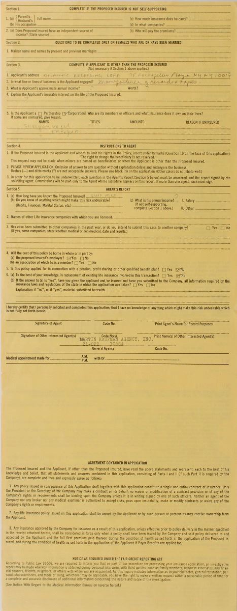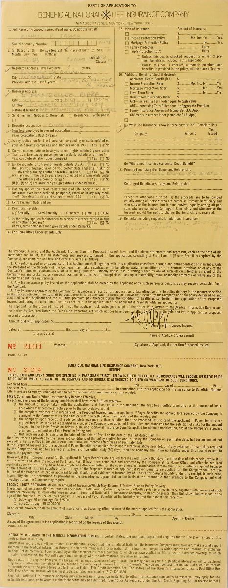 DS, signed “Mick Jagger,” one page both sides, 8.5 x 22, no date. Part one of a Beneficial National Life Insurance Company application in which Jagger names Atlantic Recording Corporation as his primary beneficiary, and requests additional insurance for “Company jet planes—20-25 per yr.” and “Racing–Cannes.” Filled in by another hand and signed at the conclusion in black ink by Jagger. In fine condition, with expected document wear.