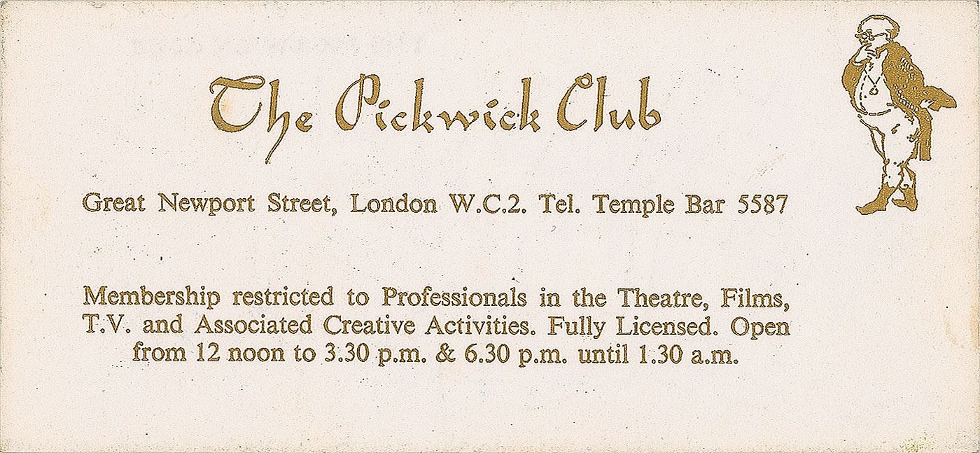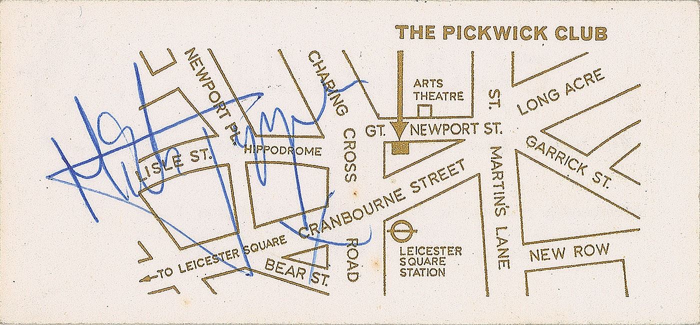 Business card for The Pickwick Club of Great Newport Street, London, 4.25 x 2, signed on the reverse in blue ballpoint, "Mick Jagger, x." In fine condition. Accompanied by a certificate of authenticity from Tracks. Consignor notes that the signature was obtained by a wine butler at The Pickwick Club. Mick Jagger, George Harrison, and John Lennon arrived at the club together one evening, and, while serving them, he requested their signatures for his teenage daughter.