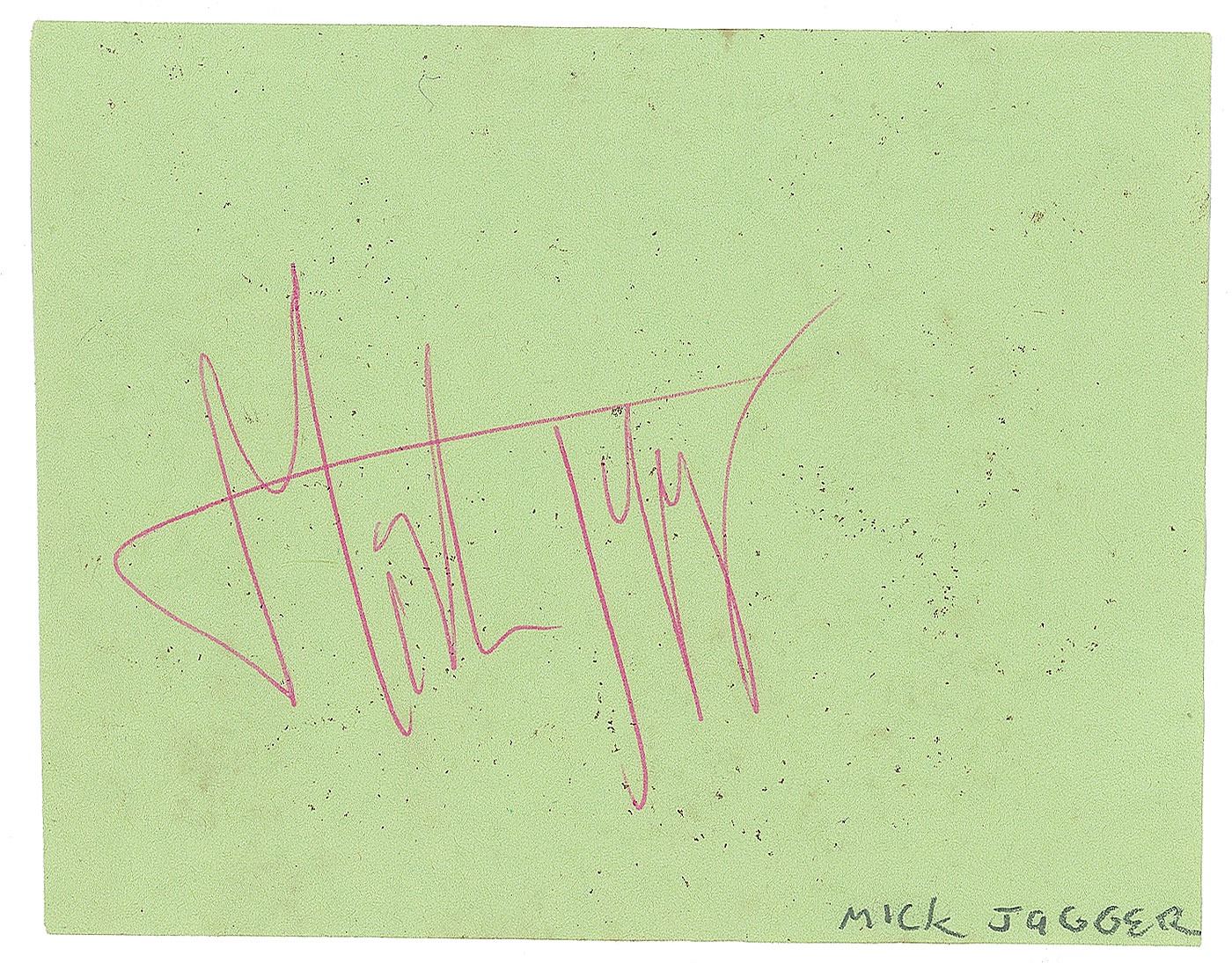 Vintage ballpoint signature, "Mick Jagger,” on a light green 4.25 x 3.5 album page. In fine condition, with scattered light soiling.
