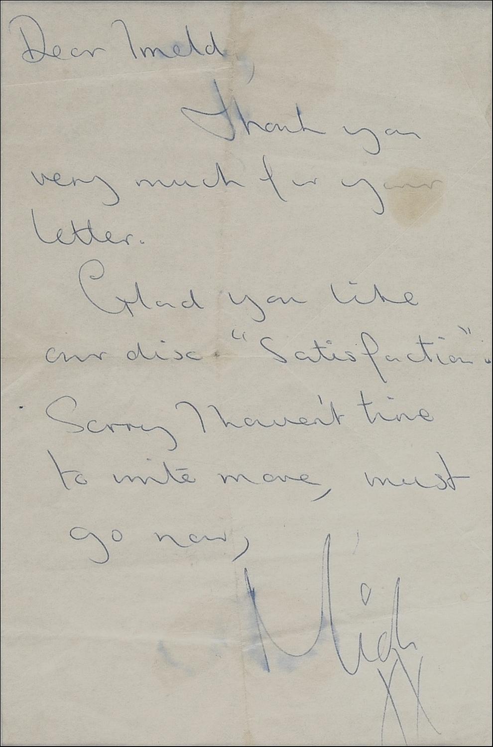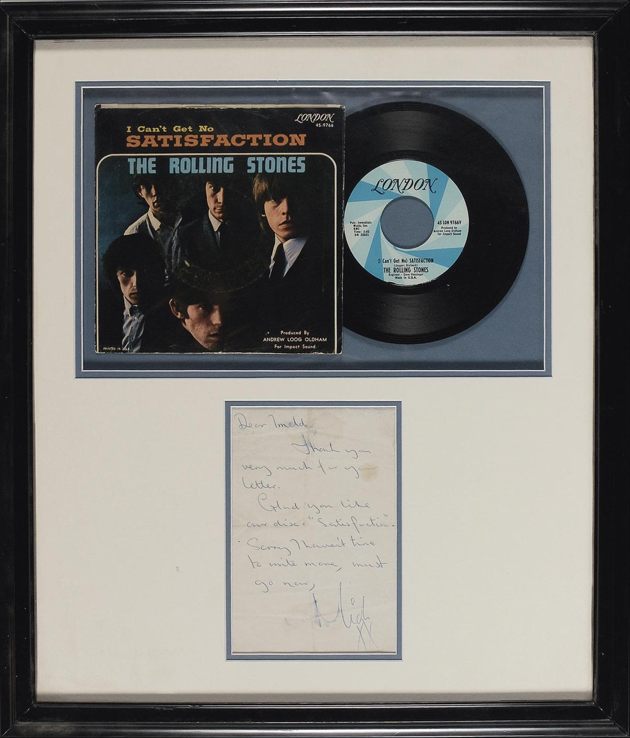 Early ALS signed “Mick, XX,” one page, 4.5 x 7, no date [1960s]. Jagger writes to a fan named Imelda. In full: “Thank you very much for your letter. Glad you like our disc ‘Satisfaction.’ Sorry I haven’t time to write more, must go now….” Double matted and framed, with a 45 rpm disc and sleeve for “Satisfaction” to an overall size of 18 x 21. Intersecting mailing folds (touching signature), wrinkling, and a few light stains and water spots (the latter resulting in running to a few words of text and the “M” of “Mick”), otherwise very good condition. ‘Satisfaction,’ was first released as a single in the United States in June 1965, giving the Stones their first number one in the United States. In Britain the single was released in August 1965; it became the Rolling Stones' fourth UK number one. In 2004 Rolling Stone magazine placed ‘Satisfaction’ in the second spot on its list of the 500 Greatest Songs of All Time. A fantastic letter mentioning one of the Stones’ earliest and best-known hits.