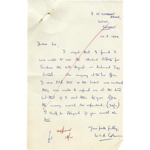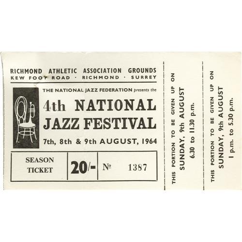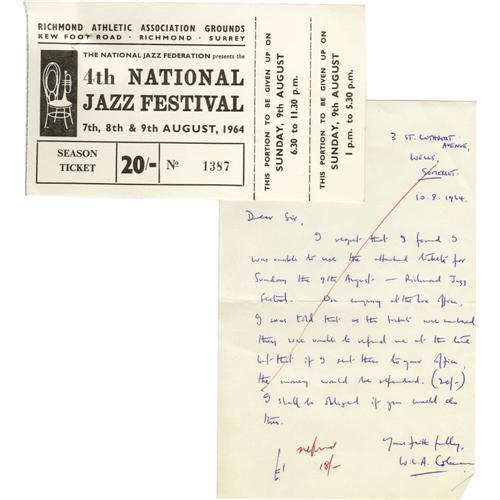 <B>Rolling Stones National Jazz Fest Ticket.</B></I> A partially used season ticket to the 4th Annual National Jazz Festival, held in Surrey in August 1964, with the unused portion for the Sunday performances still attached. The line-up featured the Rolling Stones, who were at the time on the verge of a breakthrough less than four months after the release of their first LP. It would be the last appearance of the Stones at the event; shortly thereafter they became too big an act for the festival to afford. A portion of their performance was filmed on 8mm and can be seen in the 1989 documentary <I>The Continuing Adventures of The Rolling Stones.</B></I> Still attached to the letter with a straight pin is a handwritten letter from the purchaser, in which he seeks a refund for the half-used ticket. In overall Very Fine condition with mild wear and a heavy crease to the ticket.<BR><BR><b>Shipping:</b> Flat Material, Small (<a target="_blank" href="http://www.heritageauctions.com/common/shipping.php">view shipping information</a>)