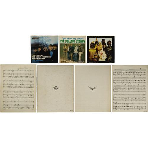 <B>Rolling Stones Records, Songbook, and Sheet Music Group (1964-68).</B></I> This varied offering features four records with picture sleeves, two songbooks, and two sheet music pieces. The pictures sleeves/records are all in EX 7/ EX 7: "Get Off My Cloud" (London 9792, 1965), "Let's Spend The Night Together" (London 904, 196), and "Jumpin' Jack Flash" (London 908, 1968). The two songbooks appear to be from 1965: "The Rolling Stones Song Album" (UK) and "The Rolling Stones Souvenir Song Book", and both are in Very Good condition with some moderate wear. The sheet music (and condition) is for "Satisfaction" (VG-FN), "Get Off Of My Cloud" (Fine), and "19th Nervous Breakdown" (FN+).