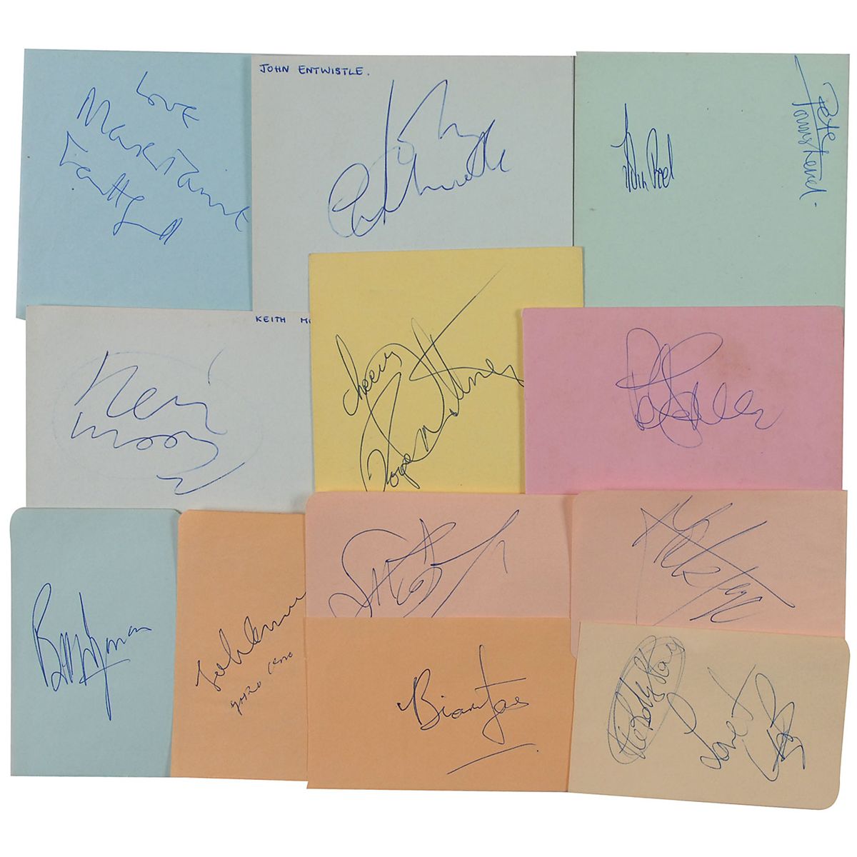A fantastic collection of signatures acquired during the filming of the Rolling Stones Rock and Roll Circus, all acquired at the InterTel Studios in London on December 10 and 11, 1968. Signers are: John Lennon and Yoko Ono on a 2.5 x 4 beige album page, signed on the reverse by Marianne Faithfull; ballpoint signatures of Mick Jagger, Keith Richards, Brian Jones, Bill Wyman, and Charlie Watts on individual 2.5 x 4 album pages, ballpoint signatures of Roger Daltrey, Pete Townshend, John Entwistle, and Keith Moon on individual 4 x 4.5 pages; signatures of Eric Clapton and Bill Wyman on a 4.5 x 4 page, signed on the reverse by Fleetwood Mac’s Peter Green; and signatures of Traffic’s Chris Wood and Jim Capaldi, and Marianne Faithfull on either side of a 4 x 4.5 album page. In fine condition. Accompanied by a certificate of authenticity from Tracks. A truly marvelous collection of signatures from a significant rock and roll event.