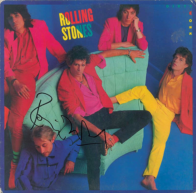 Promotional copy of Dirty Work album signed in person on the front cover in black felt tip. In fine condition, with some scattered light edge wear and label adhesive remnant to front cover. The record is not included. Originally obtained by in-person specialist Mike Wehrmann.