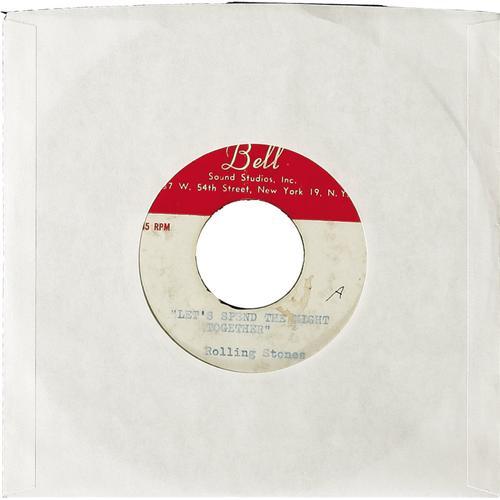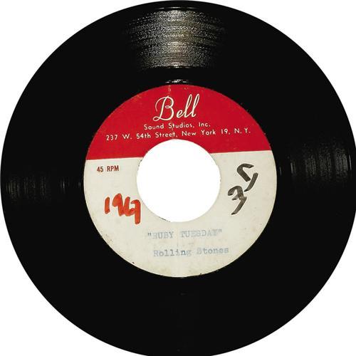 <B>Rolling Stones "Ruby Tuesday"/ "Let's Spend the Night Together" 45-rpm Acetate Bell (1967).</B></I> Both songs debuted on Billboard's Hot 100 January, 1967, with "Ruby Tuesday" eventually becoming the group's fourth #1 Pop hit. "Let's Spend the Night Together", indicated as the 'A' side on the acetate, became famous as too over-the-top for the Ed Sullivan show -- until being euphemised to "Let's Spend Some Time Together". Record has a very minor warp that does not affect the playing. Condition: EX 7. <I>From the GRT Collection</B></I>