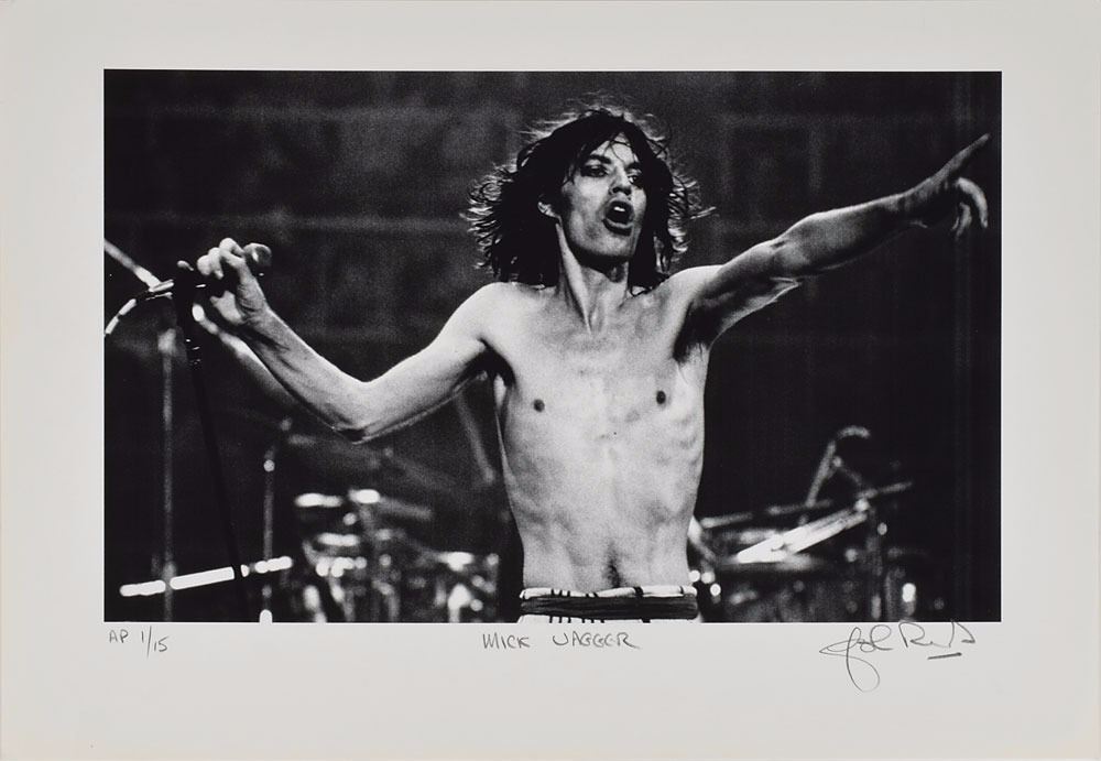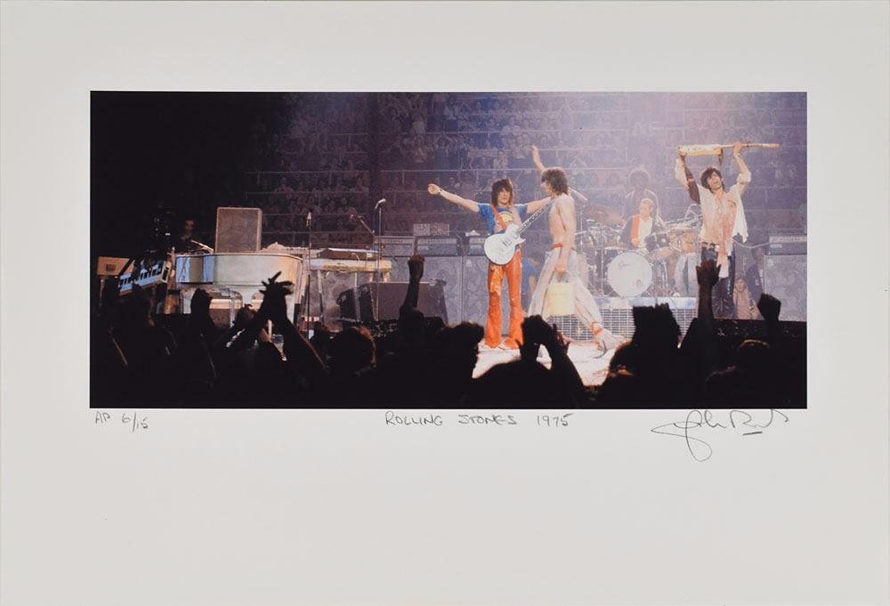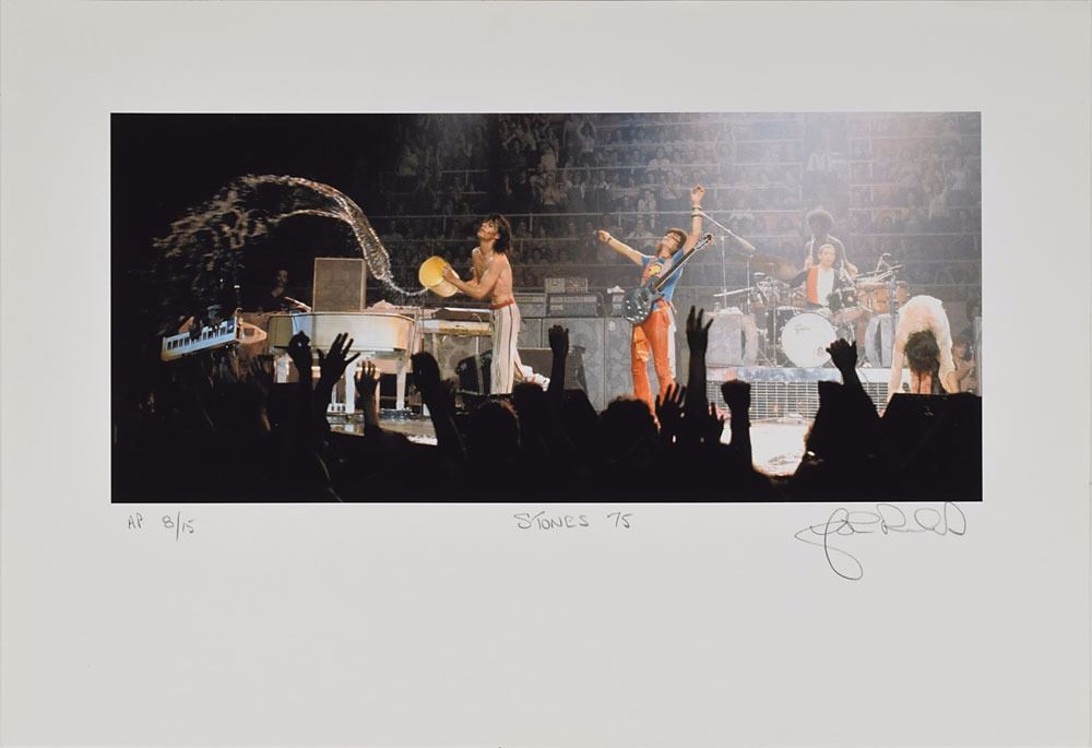 Three limited edition 19 x 13 artist proof prints, each signed in the lower border in pencil by photographer John Rowlands: one color print showing the Rolling Stones in concert in 1975, with Mick Jagger carrying a bucket across the stage, numbered AP 6/15; another color print showing the Rolling Stones in concert, with Jagger throwing a bucket of water into the crowd, numbered AP 8/15; and a black-and-white print of a shirtless Mick Jagger during an intense performance, numbered AP 1/15. In overall fine condition.