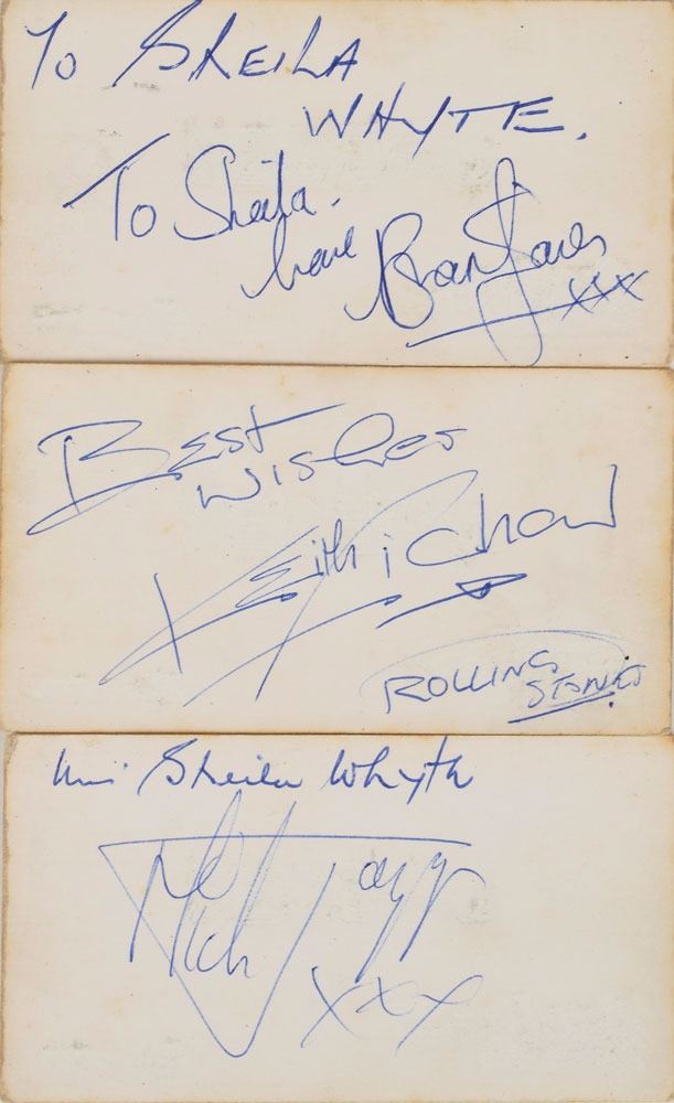 Crisp vintage set of three ballpoint signatures and inscriptions, "To Sheila, love, Brian Jones, xxx," "Best wishes, Keith Richard, Rolling Stones," and "Mick Jagger, xxx," on the reverse of individual off-white 3.75 x 2 Jaeger House business cards. Each card bears collector's ink notations. In overall fine condition, with light soiling. Accompanied by an unsigned photo of the Rolling Stones early into their career. A very early unique and very collectible set of Brian, Keith, and Mick autographs obtained when they lived together at 102 Edith Grove in the Chelsea section of London where they shared a flat together.