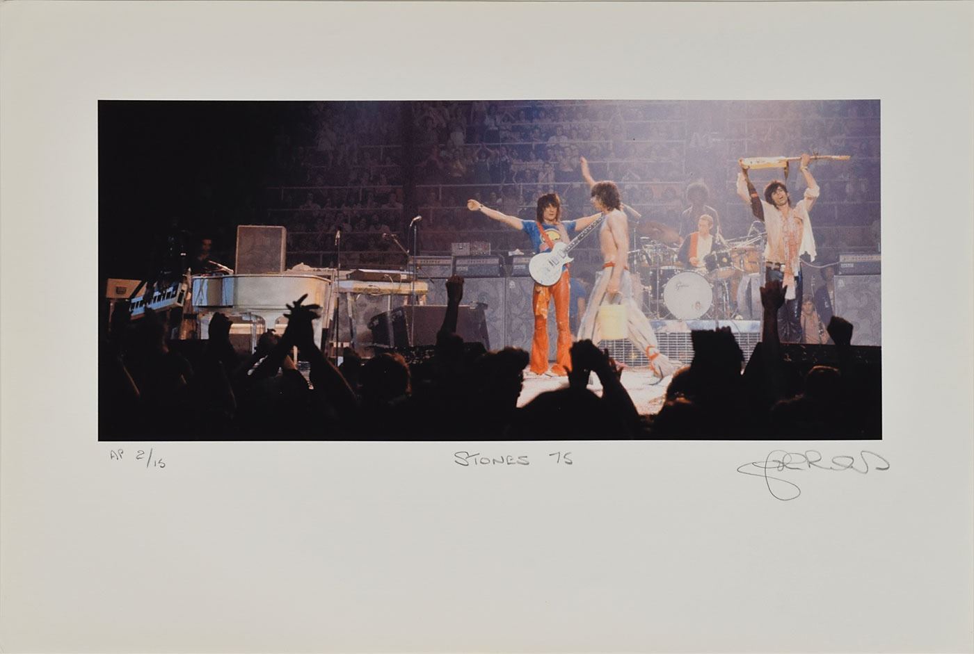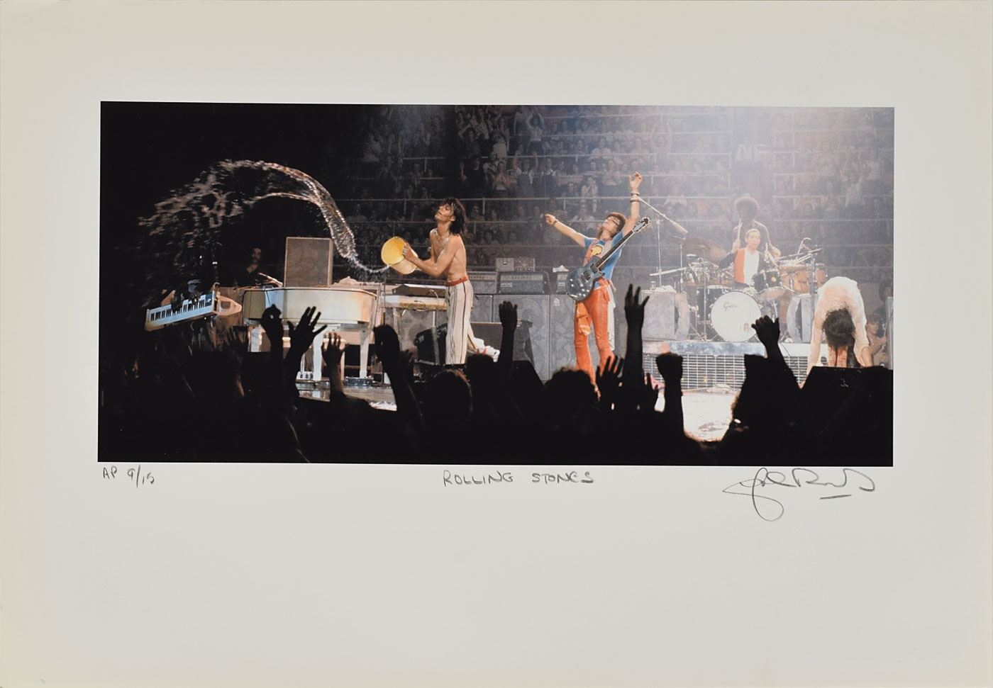 Five limited edition color 19 x 13 prints of photographs taken during a 1975 Rolling Stones show, each signed in the lower border in pencil by photographer John Rowlands, including three identical artist's proof prints, numbered AP 2/15, AP 4/15, and AP 6/15; and two limited edition prints of a different image, numbered AP 9/15 and 60/250. In overall fine condition.