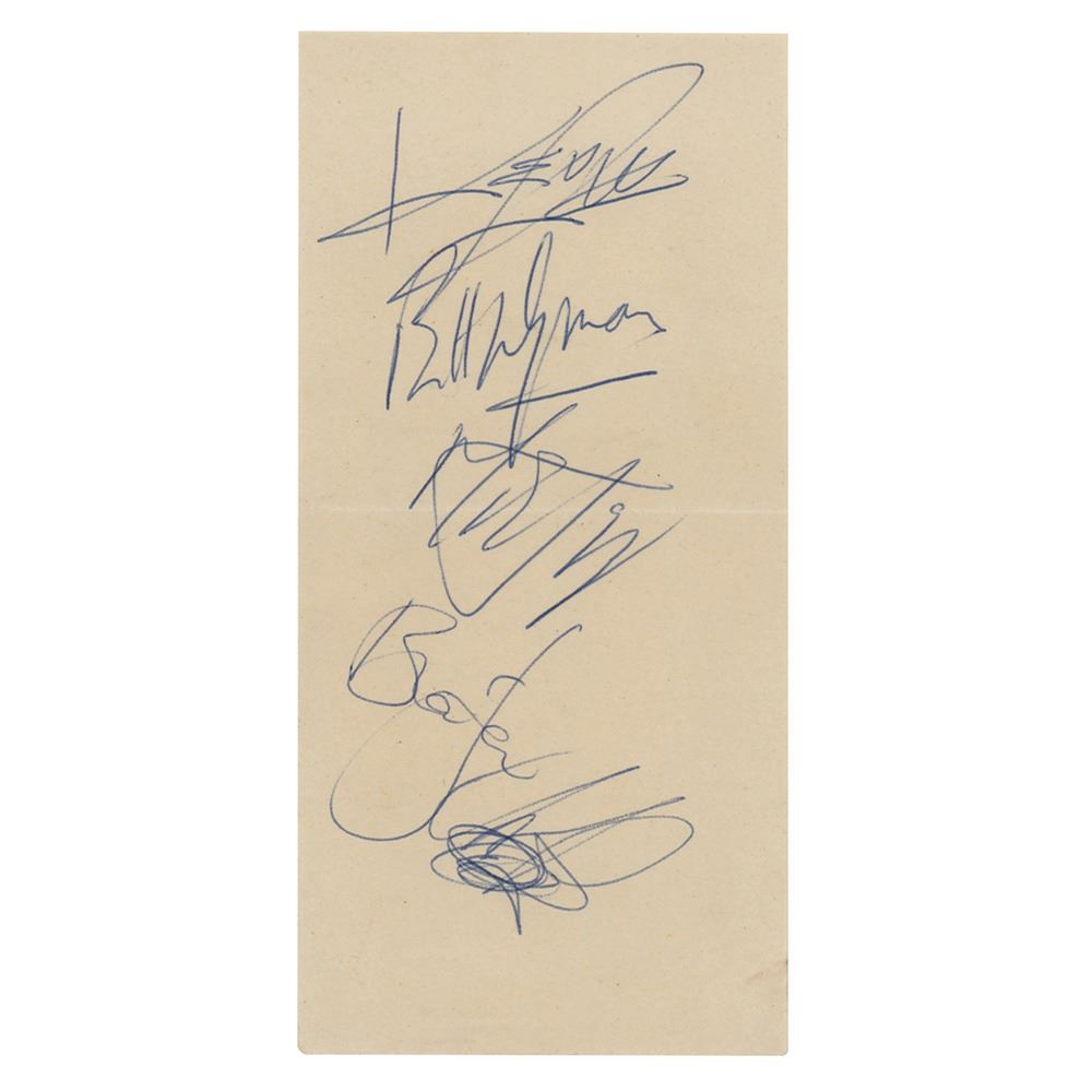 Vintage ballpoint signatures of the Rolling Stones—Keith Richards, Bill Wyman, Mick Jagger, Brian Jones, and Charlie Watts—on an off-white 2.5 x 5.25 sheet. The consignor notes that the signatures were obtained backstage at the City Hall, Sheffield, England, on May 29, 1964. In fine condition, with a faint central horizontal fold. Accompanied by a certificate of authenticity from Tracks.