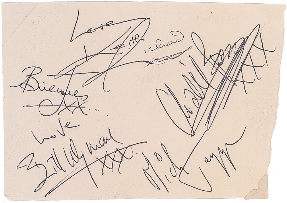 Bold vintage circa 1963 ballpoint signatures of Mick Jagger, Keith Richard, Brian Jones, Bill Wyman, and Charlie Watts, on an off-white 5.75 x 4.25 album page. An uneven right edge and some light wrinkling and creasing, otherwise fine condition. Accompanied by a handwritten letter of provenance from the original recipient which states: "The Rolling Stones autographs were obtained by me circa 1963 at their show at Urmston Baths."