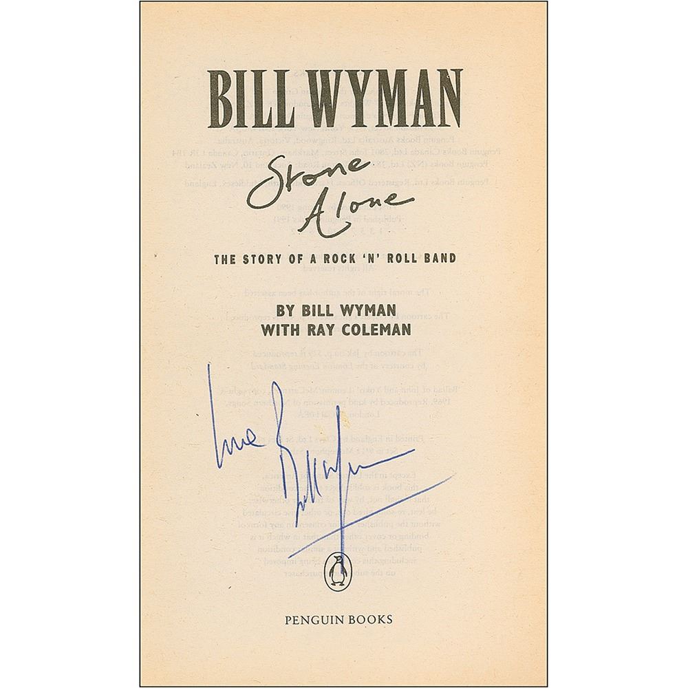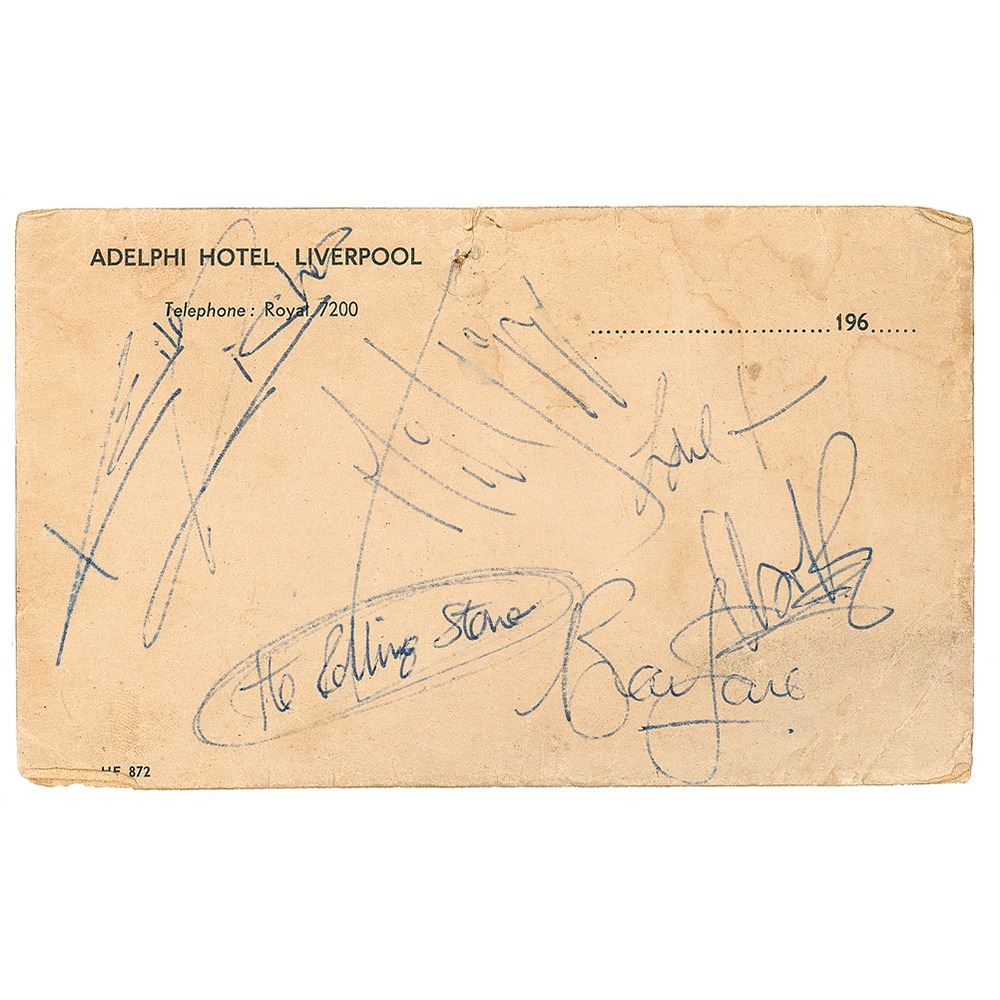 Ballpoint signatures of the Rolling Stones on two items—an off-white 5.5 x 3.25 postcard from the Adelphi Hotel in Liverpool, England, which is signed by Mick Jagger, Keith Richards, Charlie Watts, and Brian Jones; and a 4.25 x 7.25 title page from the book Stone Alone, which is signed by Bill Wyman. In overall very good condition, with creasing, staining, and a tack hole to the postcard.
