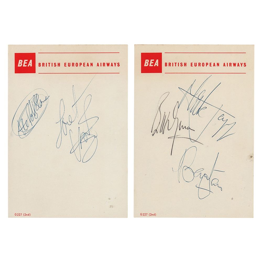 Sought-after vintage ballpoint signatures of Mick Jagger, Bill Wyman, Brian Jones, and Charlie Watts on two off-white 4.5 x 6.5 sheets of British European Airways (BEA) stationery. In fine condition, with some light creasing.