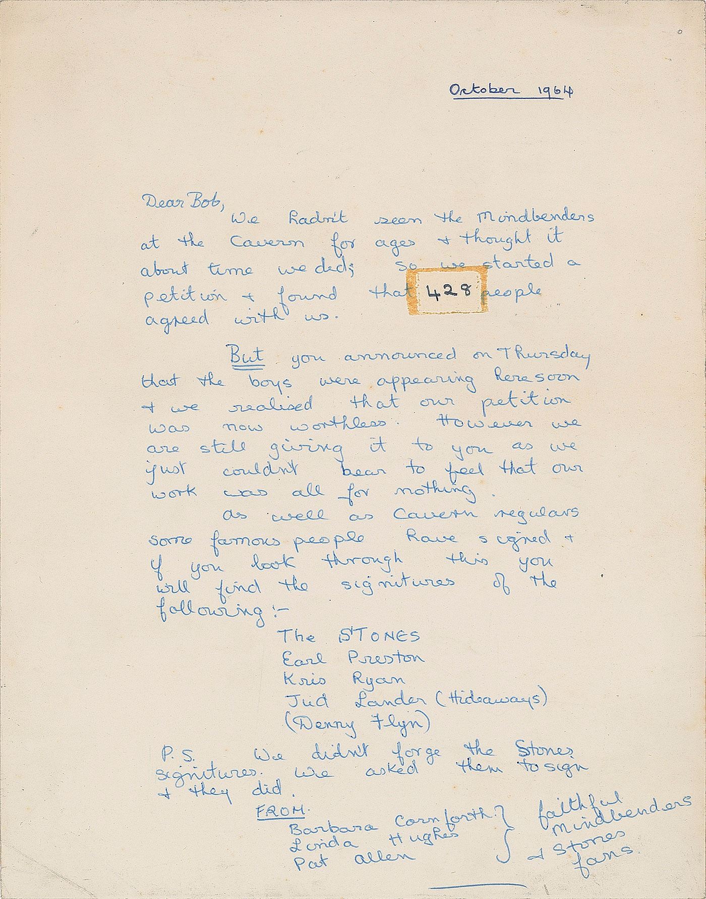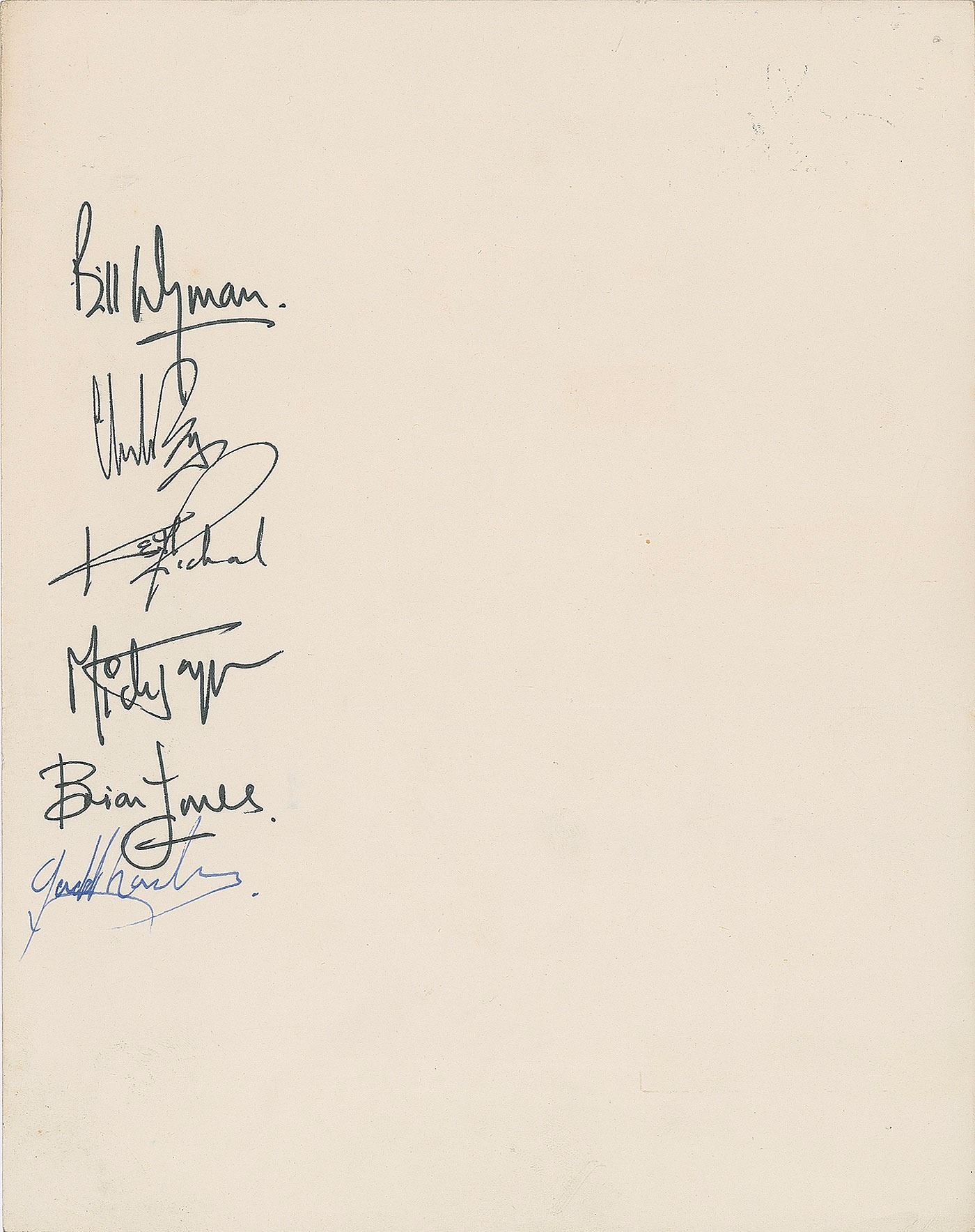 Remarkable handwritten petition addressed to Bob Wooler of the Cavern Club, requesting that he schedule a performance for the Mindbenders, one page (with an additional nine pages of signatures), each 8 x 10, October 1964. The petition features an impressive total of 428 signatures, and is highlighted by a full set of bold signatures from the Rolling Stones: Bill Wyman, Charlie Watts, Keith Richard, Mick Jagger, and Brian Jones, with an unknown signature below. The petition, in part: “We hadn’t seen the Mindbenders at the Cavern for ages & thought it about time we did; so we started a petition & found that 428 people agreed with us. But you announced on Thursday that the boys were appearing here soon & we realized that our petition was now worthless. However we are still giving it to you as we just couldn’t bear to feel that our work was all for nothing. As well as Cavern regulars some famous people have signed & if you look through this you fill find the signature of the following:—The Stones, Earl Preston, Kris Ryan, Jud Lander (Hideaways), (Denny Flyn). P. S. We didn’t forge the Stones signatures. We asked them to sign & they did.” Various pages of the petition show staining and old tape remnants, but the Stones-signed page itself is unaffected and in fine condition. Consignor notes that this petition originates from the collection of former Cavern Club compere Bob Wooler, a pivotal figure in the Merseyside music scene of the early sixties. An unusual format with a bold cast of signatures.