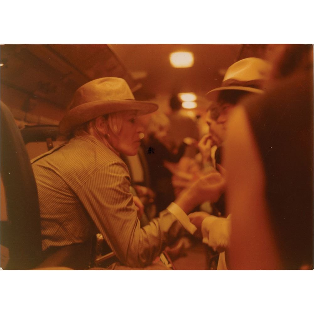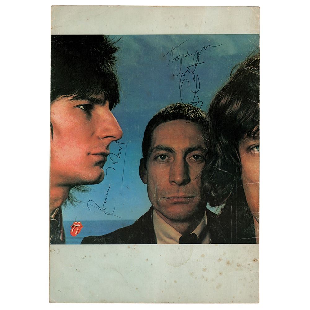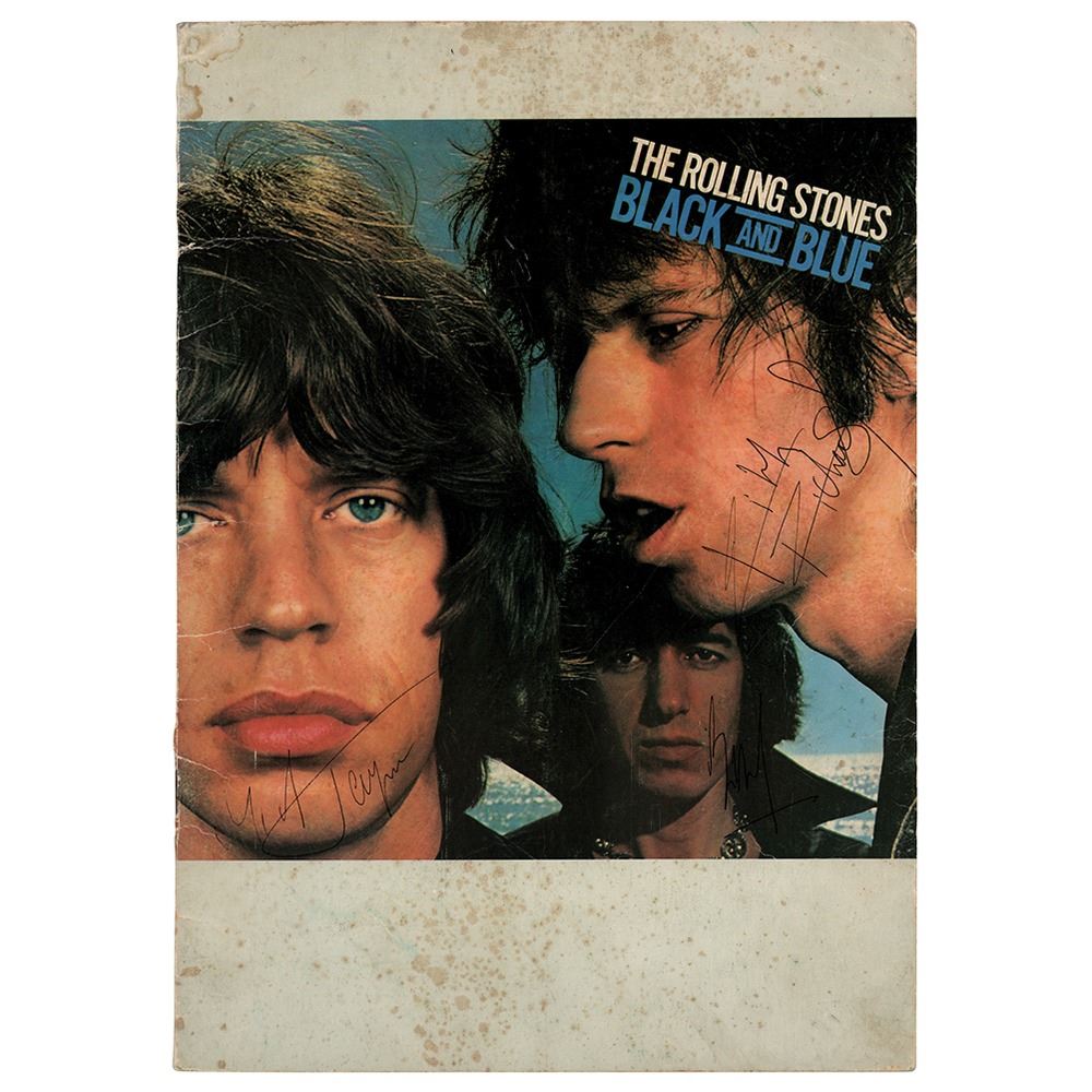 Rare program for the Rolling Stones' 'Black and Blue' tour of the United Kingdom in 1976, 20 pages, measures 16.75 x 11.75 open, signed on the front cover in black ballpoint by Keith Richards, Mick Jagger, and Bill Wyman, and on the back cover by Ronnie Wood and Charlie Watts. In very good to fine condition, with scattered spotty staining. Accompanied by a candid photo of Anita Pallenberg talking with Mick Jagger on the band's European 1976 tour bus. The consignor notes that the program and the photo were obtained from the tour's promoter.