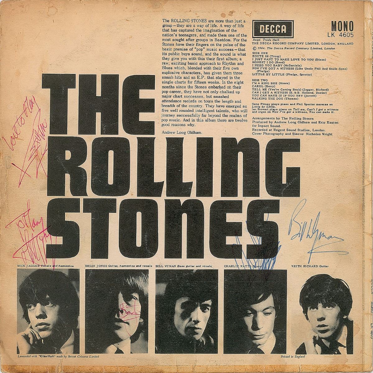 Self-titled debut album signed and inscribed on the back cover in red ballpoint, “Love to Mary, Keith Richards,” “To Mary, Mick Jagger,” and “Brian Jones,” and in black ink, “Charlie Watts” and “Bill Wyman.” In good to very good condition, with split edges (tape remnants along bottom edge), moderate toning, and some light staining; the front has substantial diagonal tear and areas of rippling and missing emulsion. The record is included. A desirable fully signed example of a vintage Stones record with great display value.