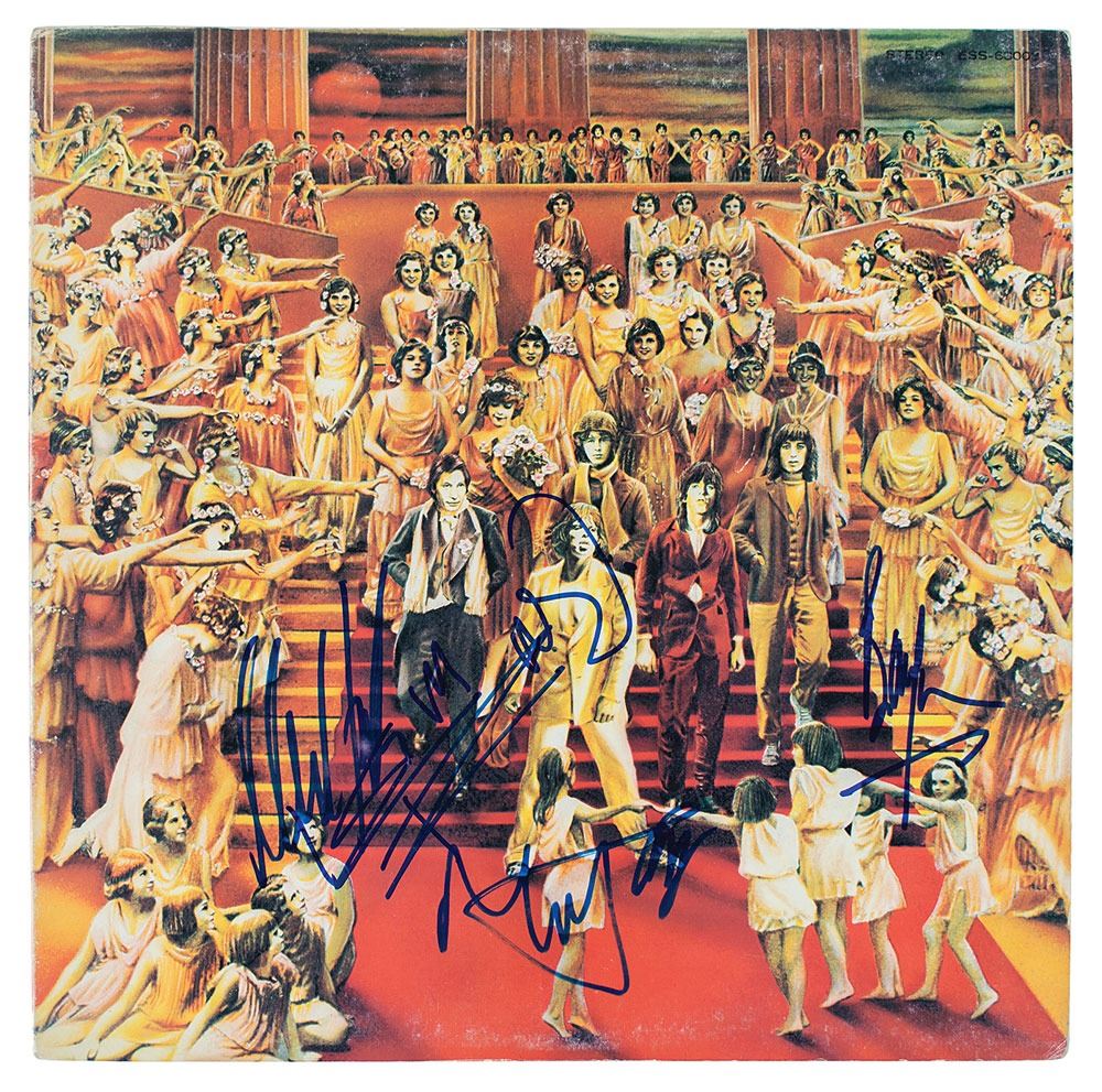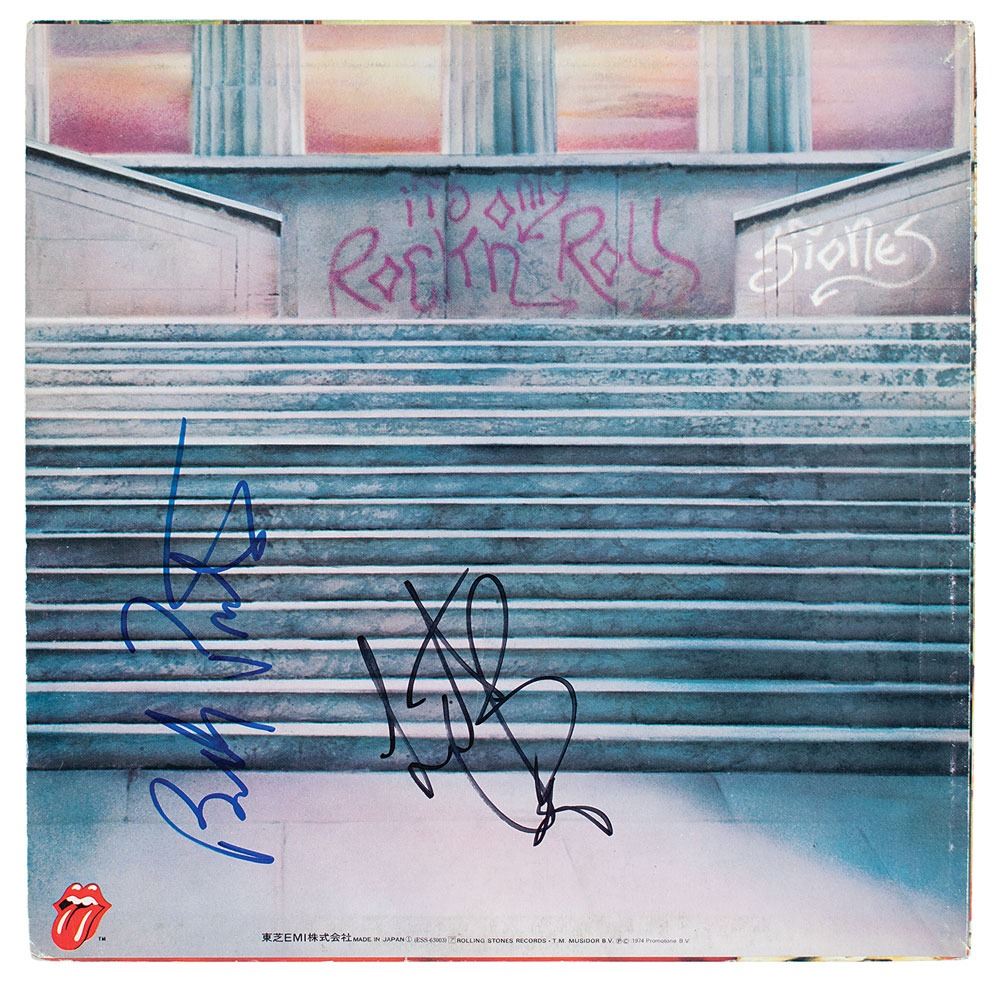 Japanese pressing of the Rolling Stones album It's Only Rock 'n Roll, signed on the front cover in blue felt tip by Mick Jagger, Keith Richards, Bill Wyman, and Mick Taylor, and on the back cover in black felt tip by Charlie Watts; the back cover is also signed by frequent Stones collaborator Billy Preston, who played piano, clavinet, and organ on the album. In fine condition, with a full, neat split to spine; if so desired, separating the front and back covers would make for a superb display. The record is included. This specific Rolling Stones lineup with Mick Taylor (1969–1974) is considered by critics and fans as the most prolific and creative iteration of the group, with a body of work including Exile on Main St., Goat Heads Soup, Sticky Fingers, and It's Only Rock and Roll. Accompanied by a John Brennan Collection letter of provenance.