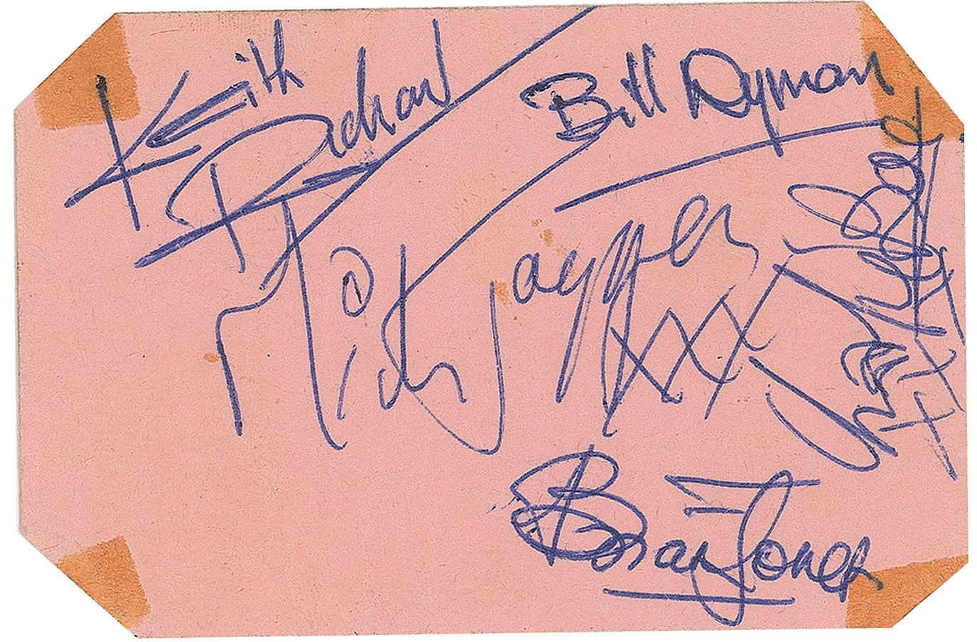 Circa late 1963 light pink “Downliners Sect” business card, 3.5 x 3.5, signed on the reverse in blue ballpoint pen, “Keith Richard,” “Bill Wyman,” “Mick Jagger, xxx,” “Charlie Boy, xxx,” and “Brian Jones.” In very good to fine condition, with tape stains to the clipped corners. Accompanied by a certificate of authenticity from Tracks.