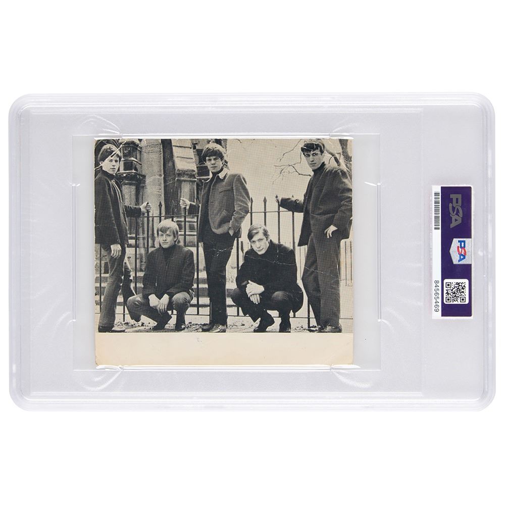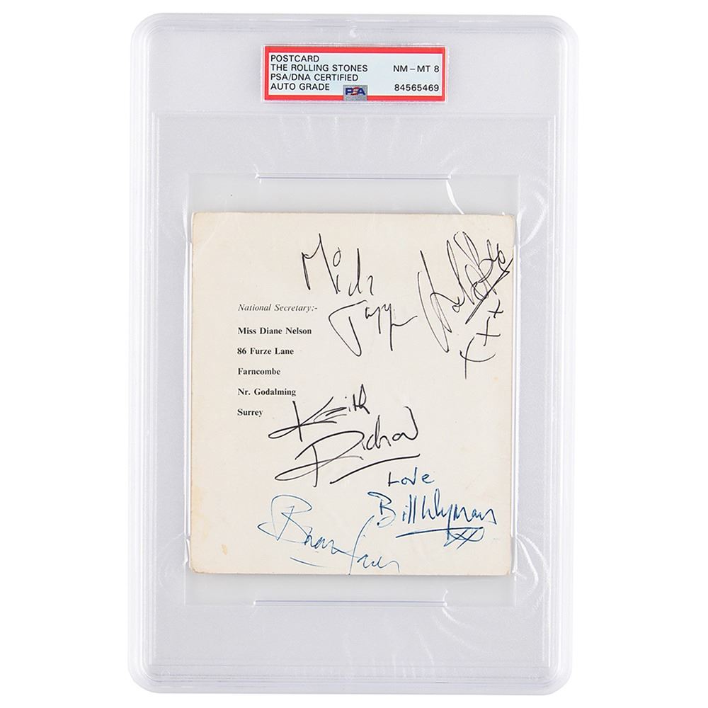 Early vintage circa 1963 Rolling Stones fan club promo card (the earliest form of a Stones fan club card), 5.25 x 4.75, signed on the reverse in black ink, "Mick Jagger," "Keith Richard," and "Charlie Boy, xxx," and in blue ballpoint, "Love, Bill Wyman, xxx" and "Brian Jones." The caption on reverse lists the address of fan club national secretary Diane Nelson. In very good to fine condition, with scattered creases (most noticeably to corners). Encapsulated and graded by PSA/DNA as "NM-MT 8."