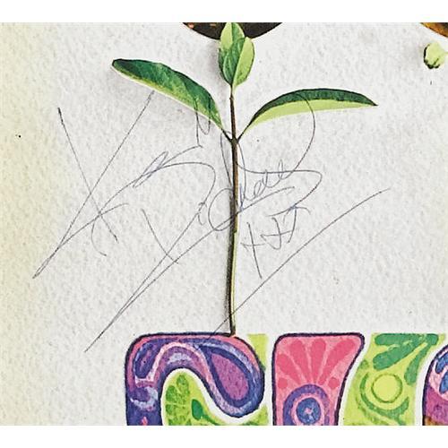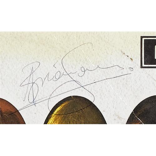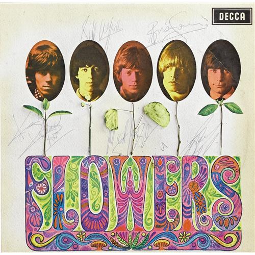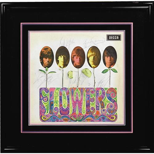 <B>Rolling Stones Signed "Flowers" Album Cover.</B></I> An original cover to the 1967 album, signed by Mick Jagger, Brian Jones, Bill Wyman, Keith Richards, and Charlie Watts in blue ballpoint. A U.S.-only release, the album was a mishmash collection of tracks that reached #3 in the States and went gold during the summer of '67. The signatures are all choice, and the presence of a rare Jones signature amongst the rest of the classic Stones line-up makes this item all the more appealing. In Very Fine condition with some tanning around the edges, matted and framed to an overall size of 20" x 20".<BR><BR><b>Shipping:</b> Framed - with Glass, Small (<a target="_blank" href="http://www.heritageauctions.com/common/shipping.php">view shipping information</a>)