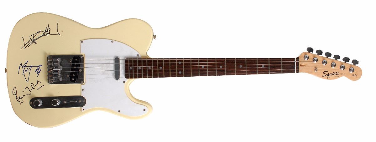 Attractive cream-bodied Affinity series Fender Squier telecaster electric guitar, serial No. CY98115458, signed on the body in black felt tip by Keith Richards and Ronnie Wood, and in blue felt tip by Mick Jagger. The back of the guitar head bears a felt tip date notation of April 30, 2000. A chip and scuffing near the Richards signature, and scattered chips and scuffs to back of the guitar, otherwise fine condition. Oversized. Originally obtained by in-person specialist Mike Wehrmann.
