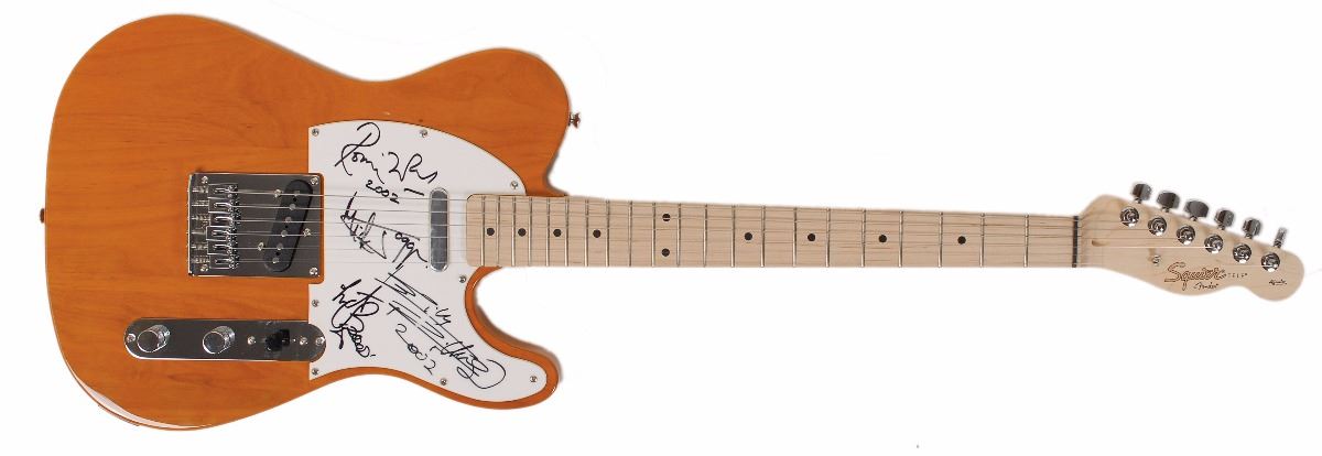 Highly appealing right-handed butterscotch blonde Affinity series Fender Squier telecaster electric guitar, serial number CY140802135, signed on the white pickguard in black felt tip by Mick Jagger, Charlie Watts, Ronnie Wood, and Keith Richards, the latter two adding the year signed, “2002.” In fine condition. Oversized. A uniform and boldly signed assemblage of the band, obtained in the very year the Stones would embark on their historic Licks Tour, a globe-trotting journey in support of their 40th anniversary compilation album, Forty Licks.