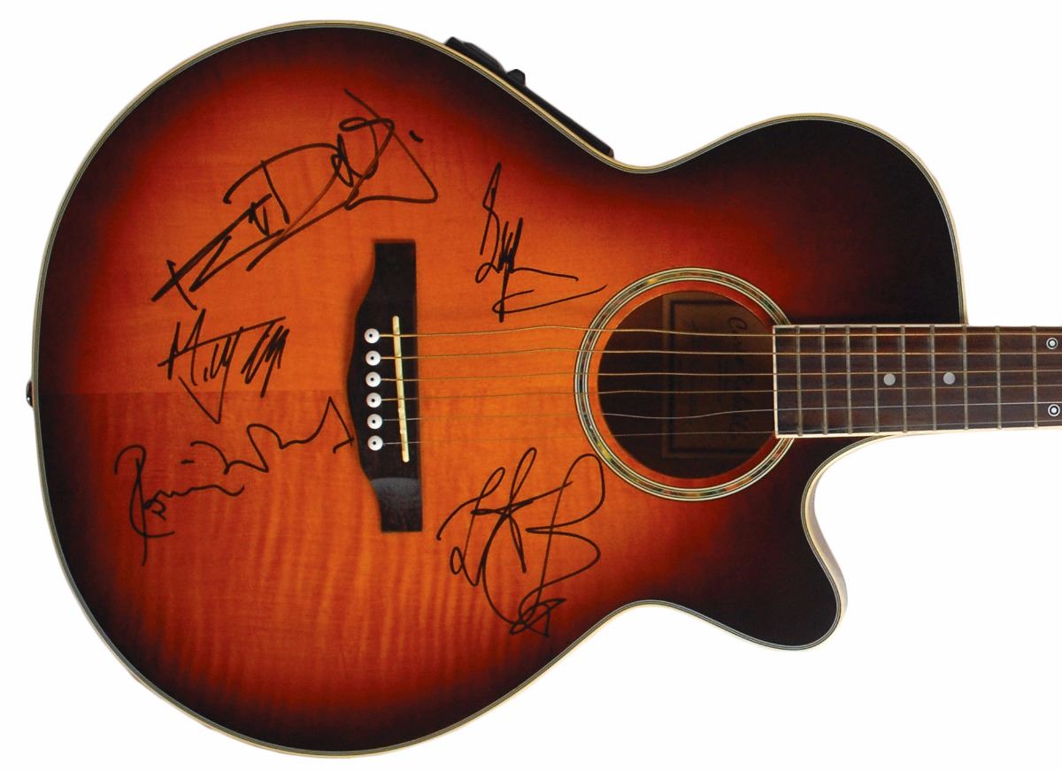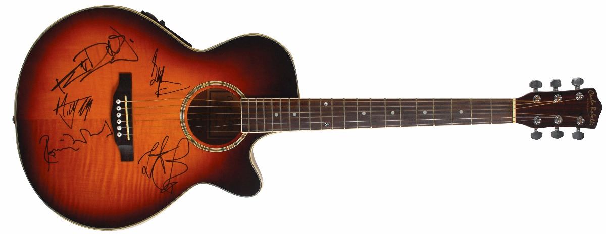 Gorgeous right-handed sunburst-finish Carlo Robelli acoustic-electric guitar, model No. SYC-700ESB, signed on the body in black felt tip by Mick Jagger, Keith Richards, Ronnie Wood, Bill Wyman, and Charlie Watts. In fine condition. Oversized. A simply beautiful instrument signed boldly by all five most recent members of the Rolling Stones. Originally obtained by in-person specialist Mike Wehrmann.