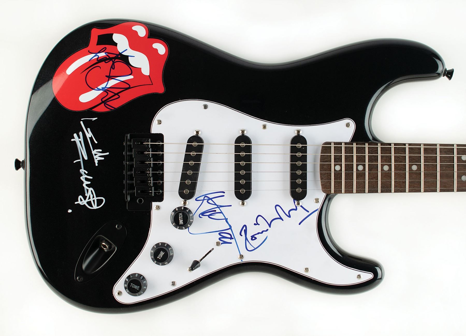 Highly displayable black-bodied Fender Squier Stratocaster electric guitar with an affixed 'tongue and lips' logo sticker, signed on the white pickguard in blue felt tip by Mick Jagger and Ronnie Wood, on the body in white paint pen by Keith Richards, and on the sticker in blue felt tip by Charlie Watts. In fine condition.