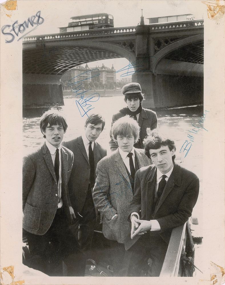 Vintage glossy 8 x 10 photo of the Rolling Stones on the water with a bridge in the background, signed in blue ballpoint by Charlie Watts, Keith Richards, Mick Jagger, Brian Jones, and Bill Wyman, with one adding “Love!” and an unknown hand adding “Stones” in the upper left corner. In very good condition, with scattered creasing, a small edge tear, tape remnants to corners, and some contrast to the signatures (mainly to the Jagger). The Stones remain scarce in vintage photos of this particular size. Pre-certified REAL.