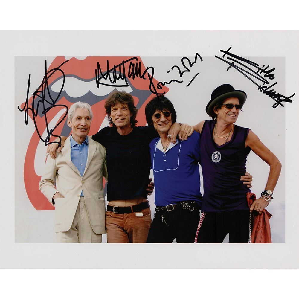 Stunning color glossy 10 x 8 photo of the Rolling Stones posing in front of their ‘tongue and lips’ logo, signed in black felt tip by the four pictured musicians: Charlie Watts, Mick Jagger, Ronnie Wood, and Keith Richards. This image was taken during a press conference when the Stones announced ‘The Bigger Bang’ world tour at Julliard Music School in New York on May 10, 2005. In very fine condition. The consignor notes that the autographs were obtained at the Frank Clair Stadium in Ottawa, Ontario, Canada on August 28, 2005. This was only the fifth date of the two-year, 90-show tour in support of the acclaimed album by the same name. The tour was met with sold-out tickets at every destination, usually within minutes of going on sale. At the time, it was the highest-grossing tour in history. Accompanied by a certificate of authenticity from Tracks. A brilliant set of autographs by ‘the world’s greatest rock ‘n’ roll band’—signed color promotional photos of the Stones are quite rare and this is an outstanding example.