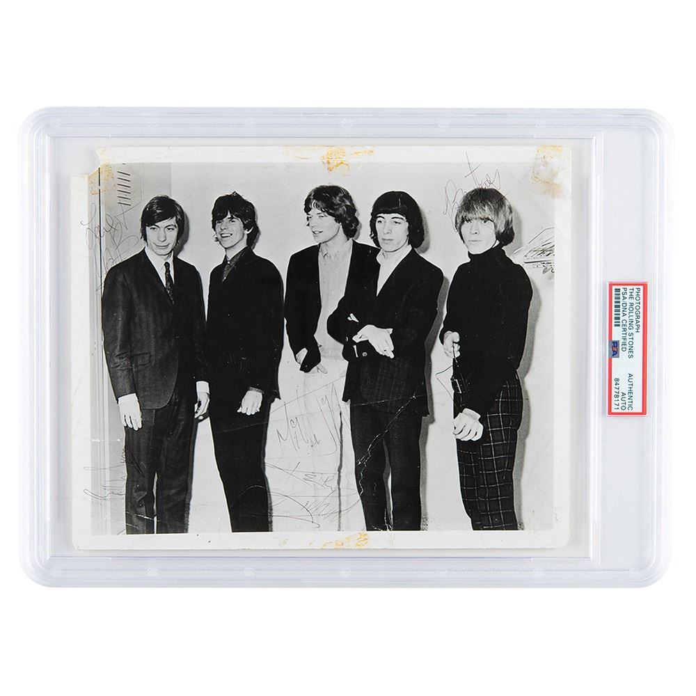 Vintage glossy 10 x 8 photo of the Rolling Stones standing together from early in their careers, signed in black ballpoint by all pictured musicians: Mick Jagger, Keith Richards, Brian Jones, Bill Wyman, and Charlie Watts. In good to very good condition, with heavy overall creasing, tape stains to the edges, and loss to the upper left corner. Encapsulated in a PSA/DNA authentication holder.