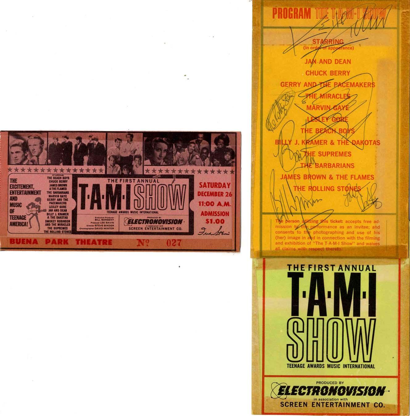 Incredible early signed ticket by the Rolling Stones, Mick Jagger, Keith Richards, Brian Jones, Bill Wyman and Charlie Watts. Signed in October 1964 at the taping of the T.A.M.I. Show in Santa Monica, California. 4'' x 6.5'' orange ticket is taped along margins, lightly touching the top portion of Richards' signature, and has an almost imperceptible trimmed upper edge. Some light toning as well. Signatures remain clear and dark. Overall in very good condition. Accompanied by PSA/DNA COA.