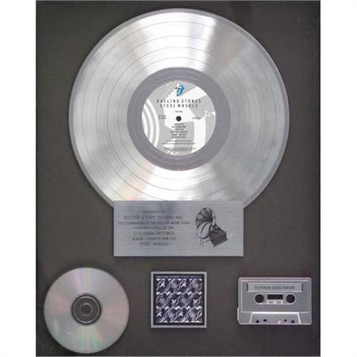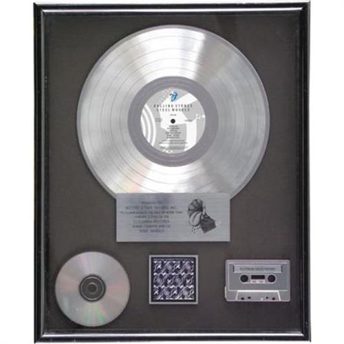 <B>Rolling Stones "Steel Wheels" RIAA Platinum Album Award.</B></I> Presented to Record & Tape Traders to commemorate the sale of more than one million copies of the Stones' 1989 comeback album, notable for the band's return to a more classic-Stones style for the subsequent world tour, the band's biggest so far. It was also the last studio album to feature original bassist Bill Wyman. Framed to an overall size of 17" x 21" and in Excellent condition.<BR><BR><b>Shipping:</b> Framed - with Glass, Small (<a target="_blank" href="http://www.heritageauctions.com/common/shipping.php">view shipping information</a>)